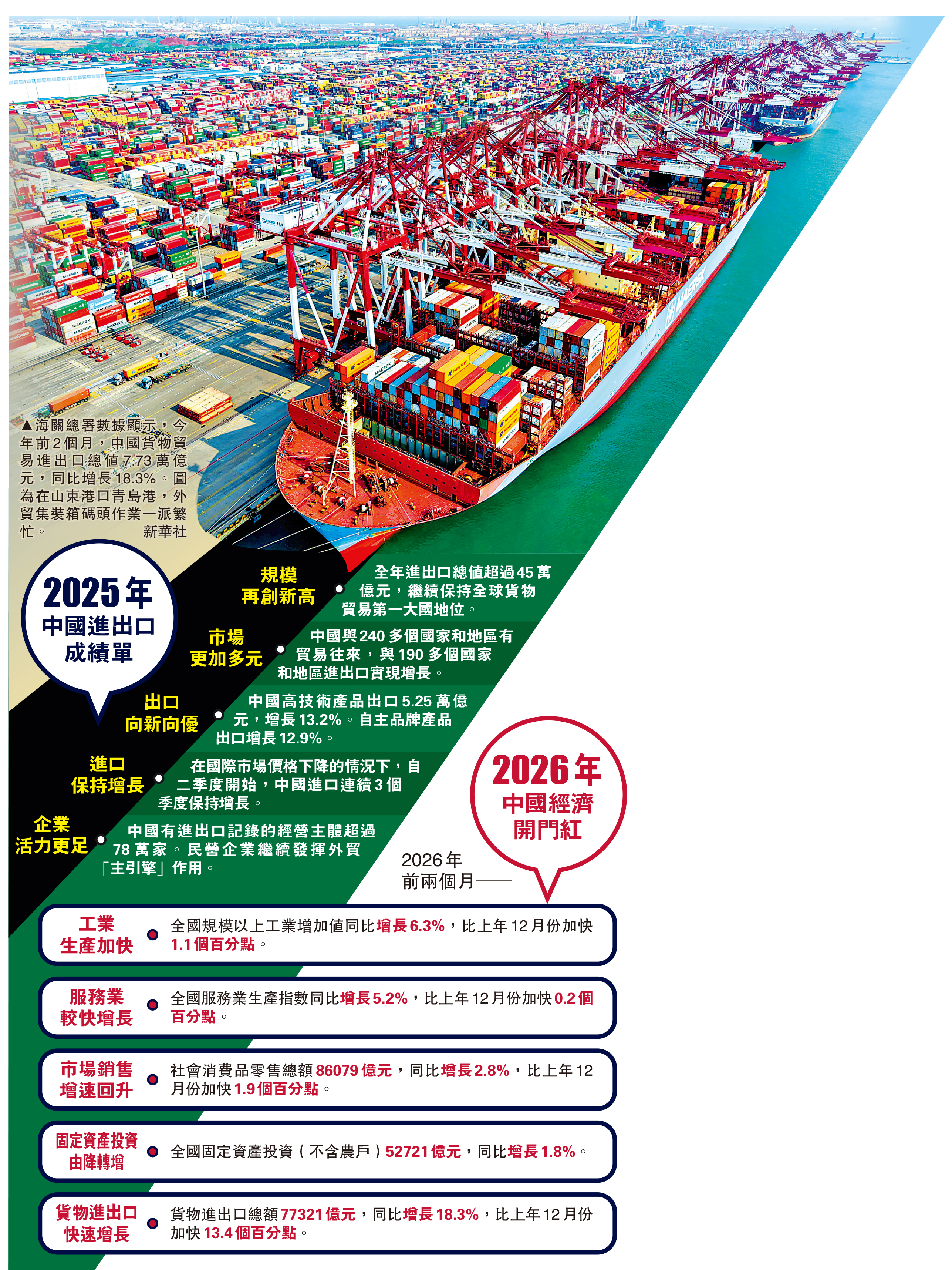 【大公報訊】綜合記者張寶峰、新華社報道:「十五五」開局之年,我國外貿穩中有進,韌性和活力進一步彰顯,今年前2個月,中國貨貿進出口總值7.73萬億元,同比增長18.3%。中國人民大學重陽研究院研究員劉英表示,近幾年,國際環境的變化和波動越發複雜深刻、不確定,特別是各種風險挑戰越發嚴峻。但在這樣的條件下,中國仍然取得了如此亮眼的發展成績單,足以證明中國經濟底盤穩、韌性足、潛力大,這也讓全世界對中國未來的發展充滿信心。