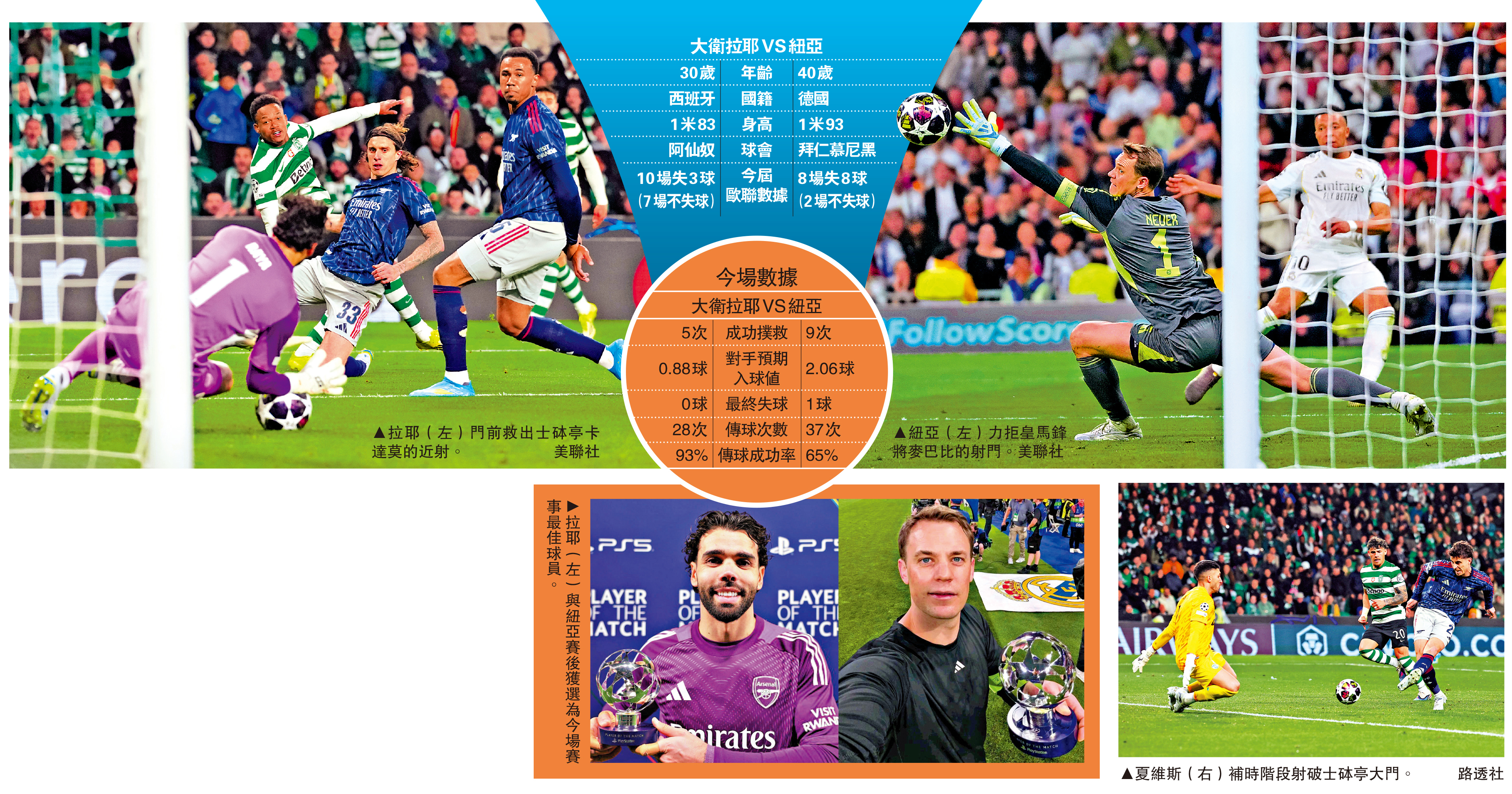 德甲和英超領頭羊、拜仁慕尼黑與阿仙奴,8日凌晨歐聯8強首回合同樣客場先拔頭籌,分別以2:1和1:0擊敗皇家馬德里與士砵亭,兩隊贏波關鍵人物並非入球者,而是門將紐亞和大衛拉耶。已屆40歲的紐亞再發揮巔峰演出,全場作出9次撲救,成功令對手皇馬的預期入球值減半;拉耶亦保持一貫穩定的表現全場5救必入球,為球隊補時入波奠定基礎,而兩人賽後亦齊齊獲官方選為比賽的最佳球員,絕對實至名歸。\大公報記者 譚德龍