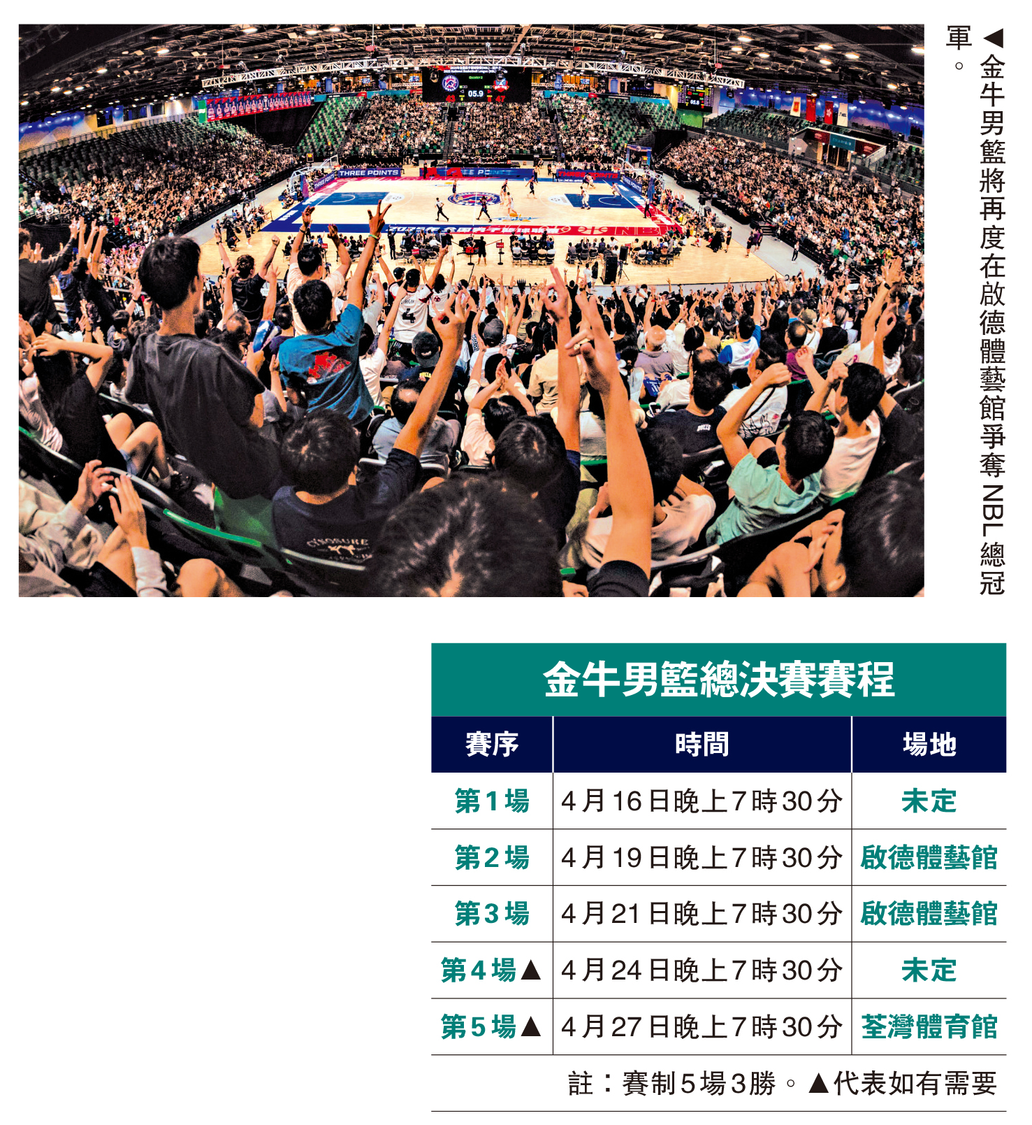 【大公報訊】記者朱家立報道:香港金牛7日在全國男子籃球聯賽(NBL)季後賽4強第3回合擊敗江西鯨裕清酒,以大比分3:0再度晉級賽制為5場3勝的總決賽。力爭達成3連霸的金牛8日公布總決賽賽程及主場安排,當中第2、3回合將落戶啟德體藝館舉行,如有第5回合則移師荃灣體育館。