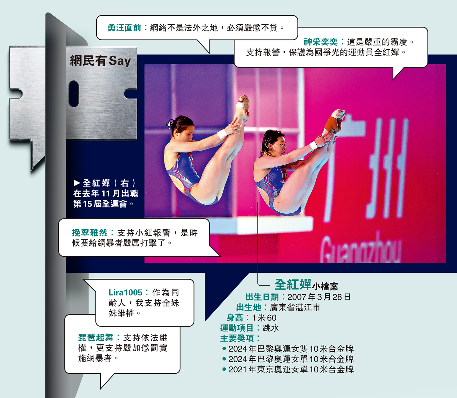 廣東省二沙體育訓練中心微信公眾號4月8日發文稱:「近日,我中心跳水運動員全紅嬋涉嫌遭受網暴一事,受到社會的高度關注,我中心已向公安機關報警。全紅嬋作為一名為國家贏得榮譽的年輕運動員,在成長過程中承受了不應有的輿論壓力和精神傷害,對此,我中心表示嚴重關切,並堅決反對。」