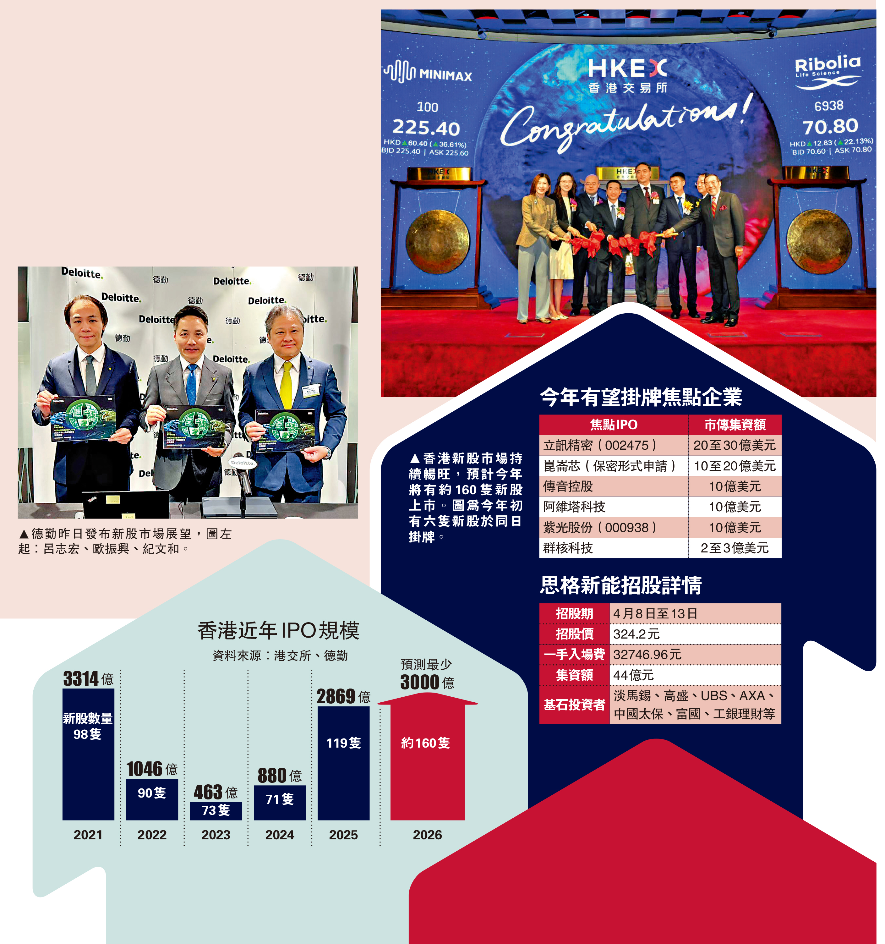香港新股市場延續暢旺氣氛。會計師行德勤預測,今年市場將有約160隻新股上市,大部分上市申請人為內地龍頭企業、現有A股發行人以及尋求出海發展的公司,集資規模有望超過3000億元,可穩守全球三甲之列。