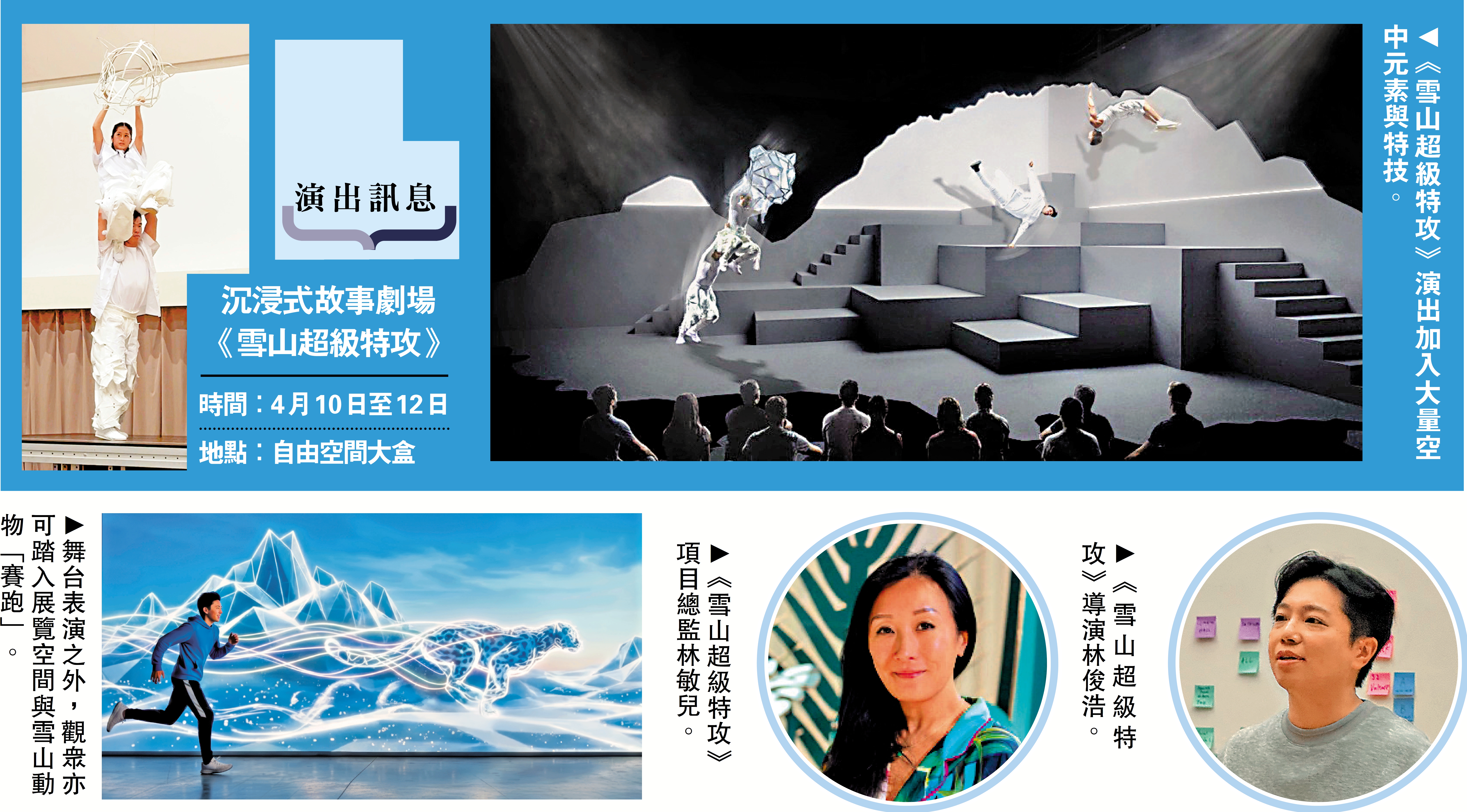 作為「吾係動物園」系列的最新作品,《雪山超級特攻》把展覽延伸至表演場域,將於4月10日至12日在自由空間大盒上演。項目總監及聯合藝術總監林敏兒,以及聯合藝術總監、導演及聯合編舞林俊浩近日接受《大公報》訪問,談及作品如何透過表演重構觀眾與自然、與他者的關係,並希望觀眾在劇場中「自行感受物種間的關係,而非被直接提供答案」。\大公報記者 郭悅盈