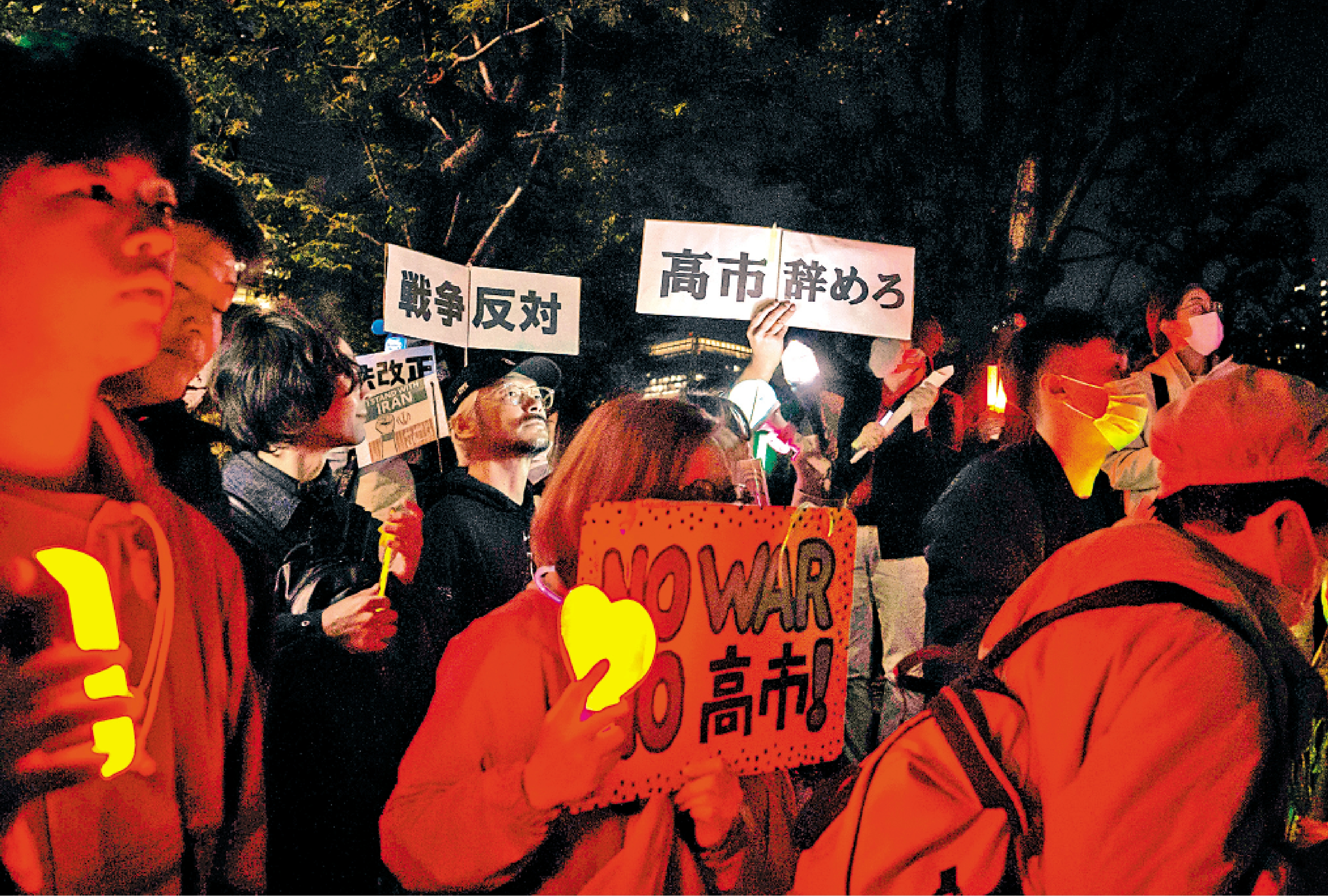 在集會現場,抗議者手持寫有「守護憲法第九條」「不要戰爭」「高市政權即刻下台」等字樣的標語,高喊「反對修憲」「反對戰爭」等口號,呼籲維護和平憲法。