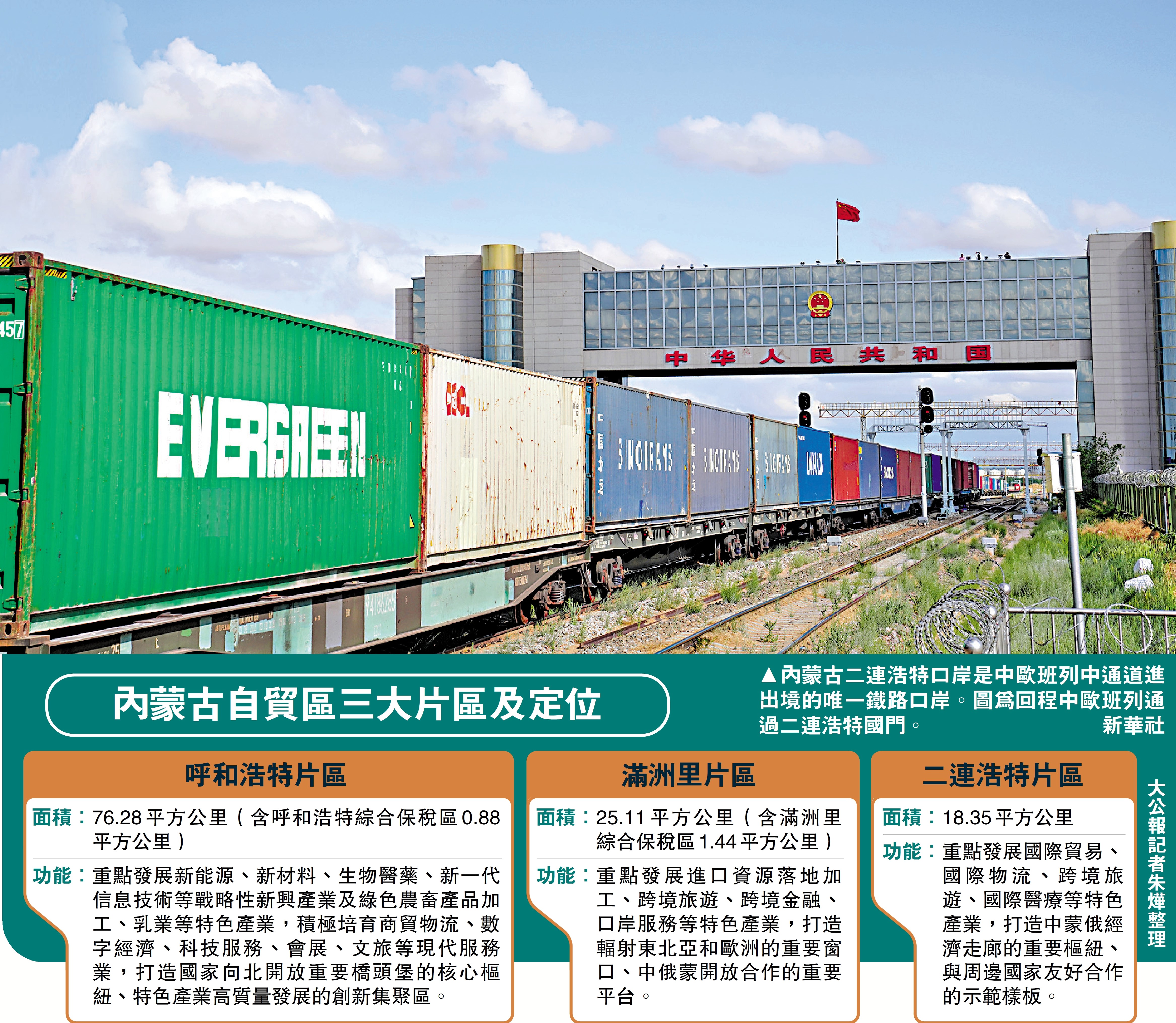 中國(內蒙古)自由貿易試驗區的實施範圍為119.74平方公里,涵蓋三個片區:呼和浩特片區、滿洲里片區和二連浩特片區。值得注意的是,作為中蒙最大陸路口岸,位於內蒙古的二連浩特鐵路口岸自2013年通行中歐班列以來,去年首次實現年內突破3500列大關,創歷史新高,今年一季度,中歐班列通行量再創歷史新高,為中蒙歐經貿往來增添新動能。\大公報記者 朱燁北京報道
