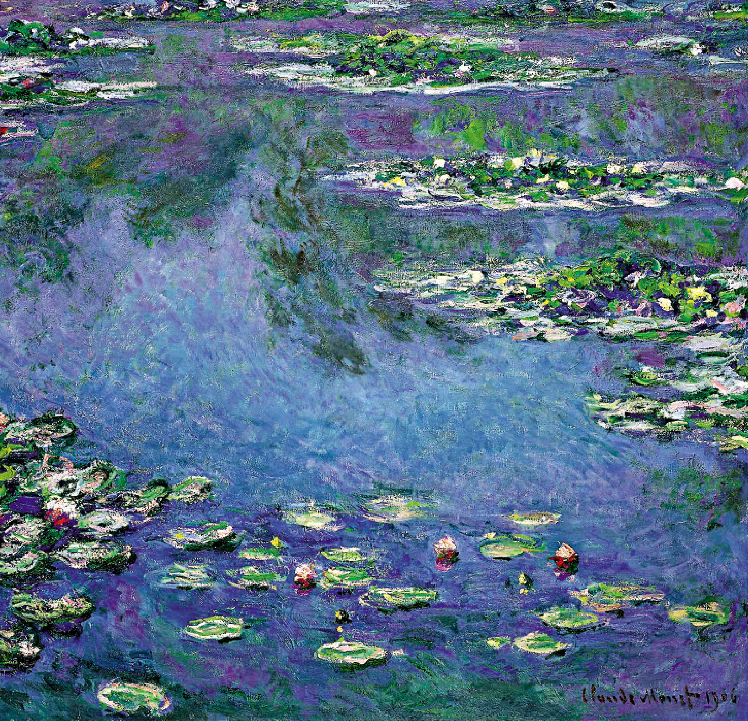 莫奈晚年幾乎足不出戶,他在巴黎郊外的吉維尼花園度過生命最後三十年。一八九○年,莫奈購下這座宅邸後親手改建,打造人工池塘,遍植睡蓮,並搭建日本橋,從此這片花園成為他創作的核心靈感泉源。他曾說:「我花了好長一段時間,才真正懂得我的睡蓮……一處風景,不會在一日之間佔據你的心。直到某天,我忽然感受到池塘的魔幻魅力,如同啟示降臨。我拿起調色盤。自那之後,幾乎再沒有換過其他的主題。」