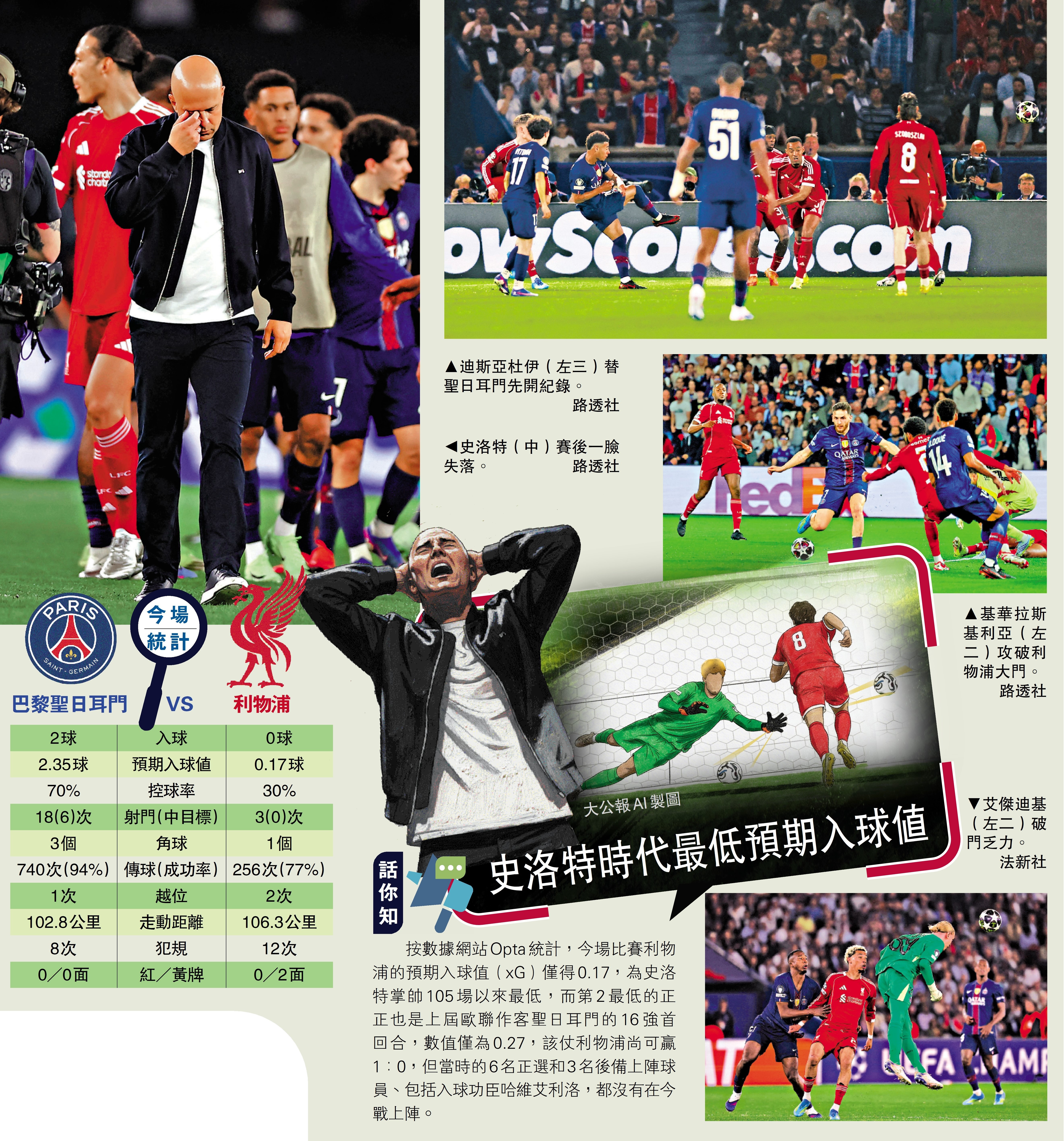 歐聯8強首回合第2日賽事,於香港時間9日凌晨上演,焦點之一為利物浦作客衛冕冠軍的巴黎聖日耳門。儘管有自知之明罕有地排出5後衛陣式,但利物浦依然在巴黎主場被打得無還手之力,最終以0:2落敗。球隊全場僅3次射門之餘亦無一命中目標,預期入球值低至0.17,為主帥史洛特上任以來最低一場賽事。而他繼上場英足盃慘吞曼城「4蛋」竟發表「慶幸輸得少」言論後,今場賽後再稱只輸2球實在幸運,嚴重打擊球員士氣。\大公報記者 譚德龍