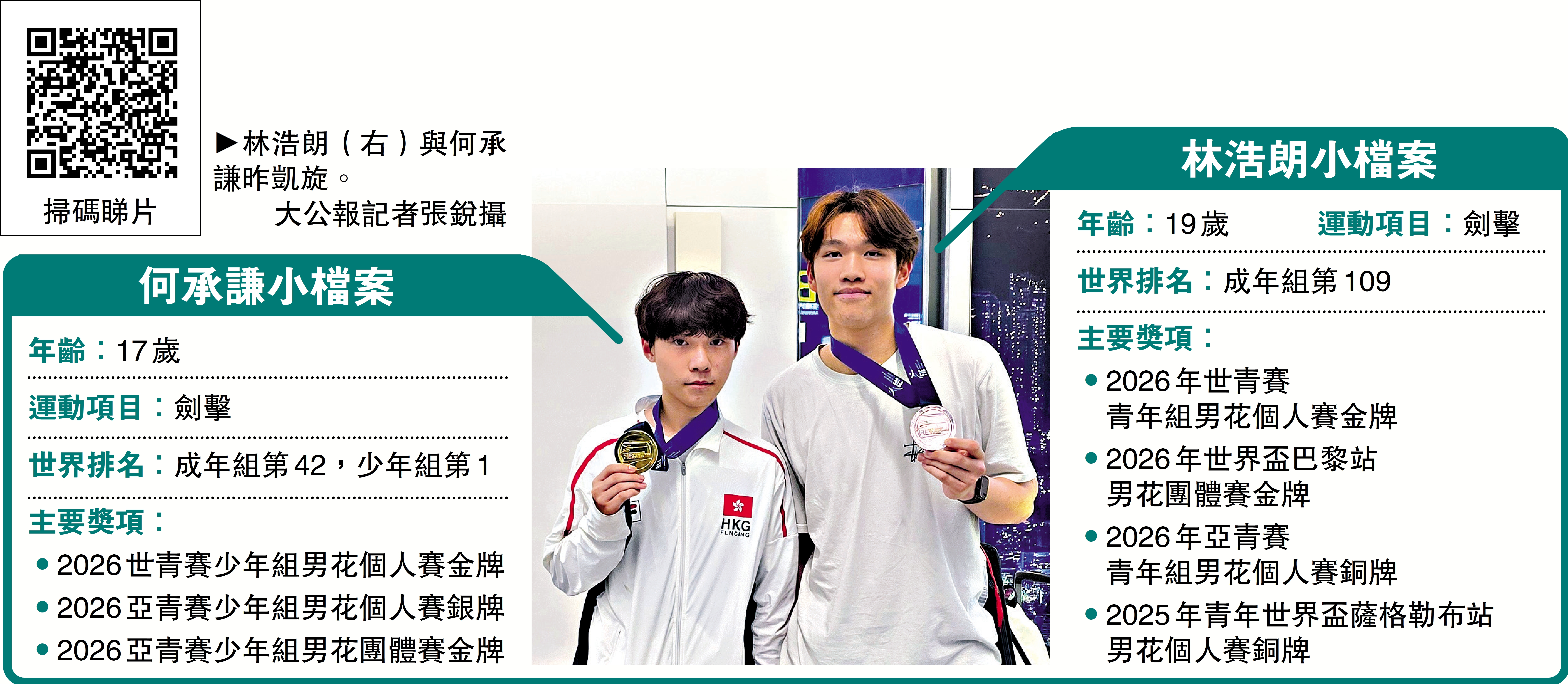 【大公報訊】記者張銳報道:日前在巴西舉行的世界青少年劍擊錦標賽分別奪得青年組及少年組男子花劍個人賽金牌的中國香港劍擊新星林浩朗與何承謙9日凱旋,兩人除暢談奪冠心路外,更表明將以7月在香港舉行的世界錦標賽及9月的名古屋亞運會為下一目標,並同聲表示希望追上奧運會金牌張家朗及世界冠軍蔡俊彥的成就。