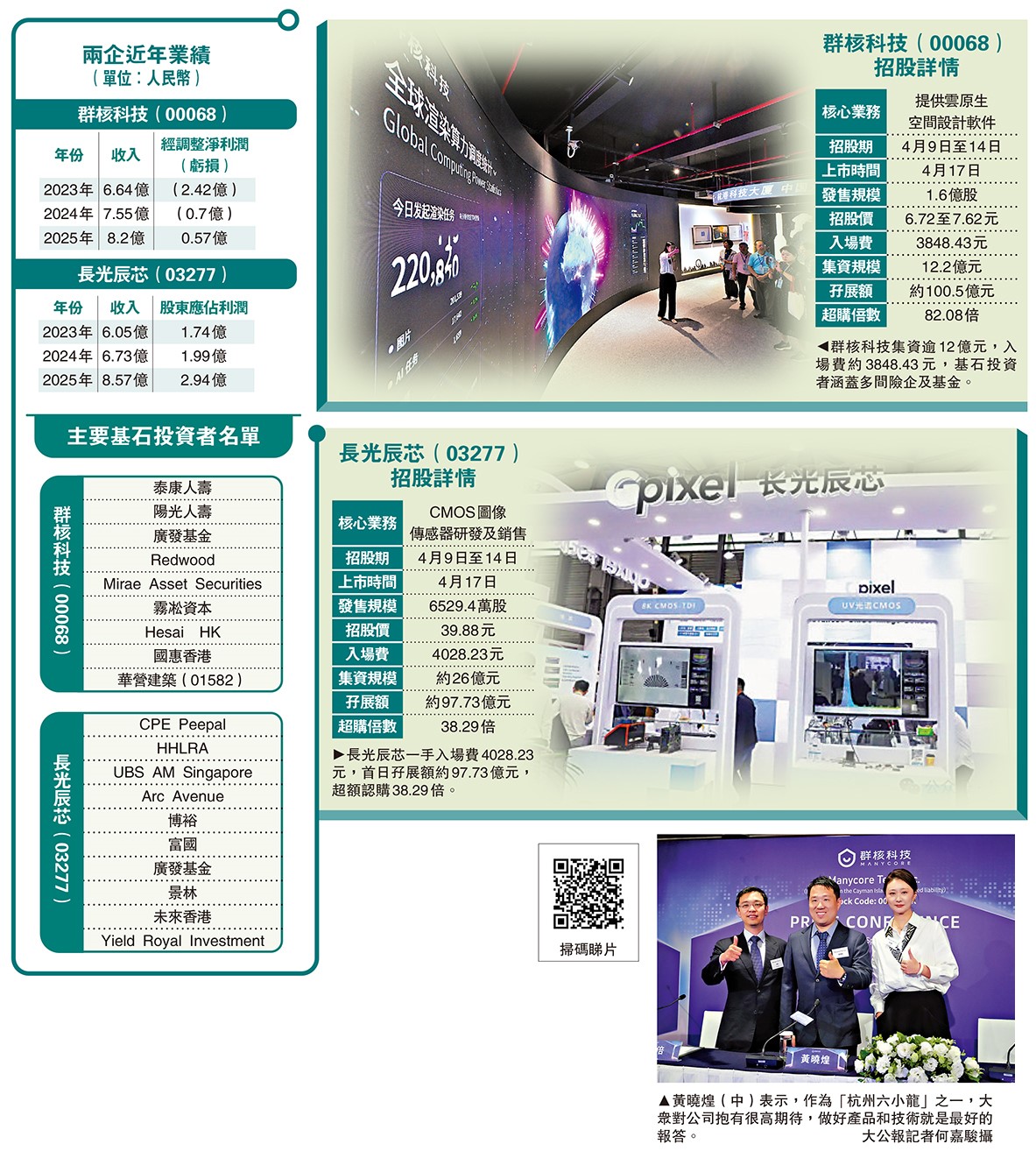 本港昨日再有兩隻新股派表招股,其中「杭州六小龍」之一的群核科技(00068)集資逾12億元,散戶入場費約3848.43元,基石投資者涵蓋多間險企及基金。首席財務官沈倍表示,公司未來將加速拓展海外市場,將部分IPO資金用於組建銷售團隊,希望進一步提升海外收入的佔比。\大公報記者 蔣去悄