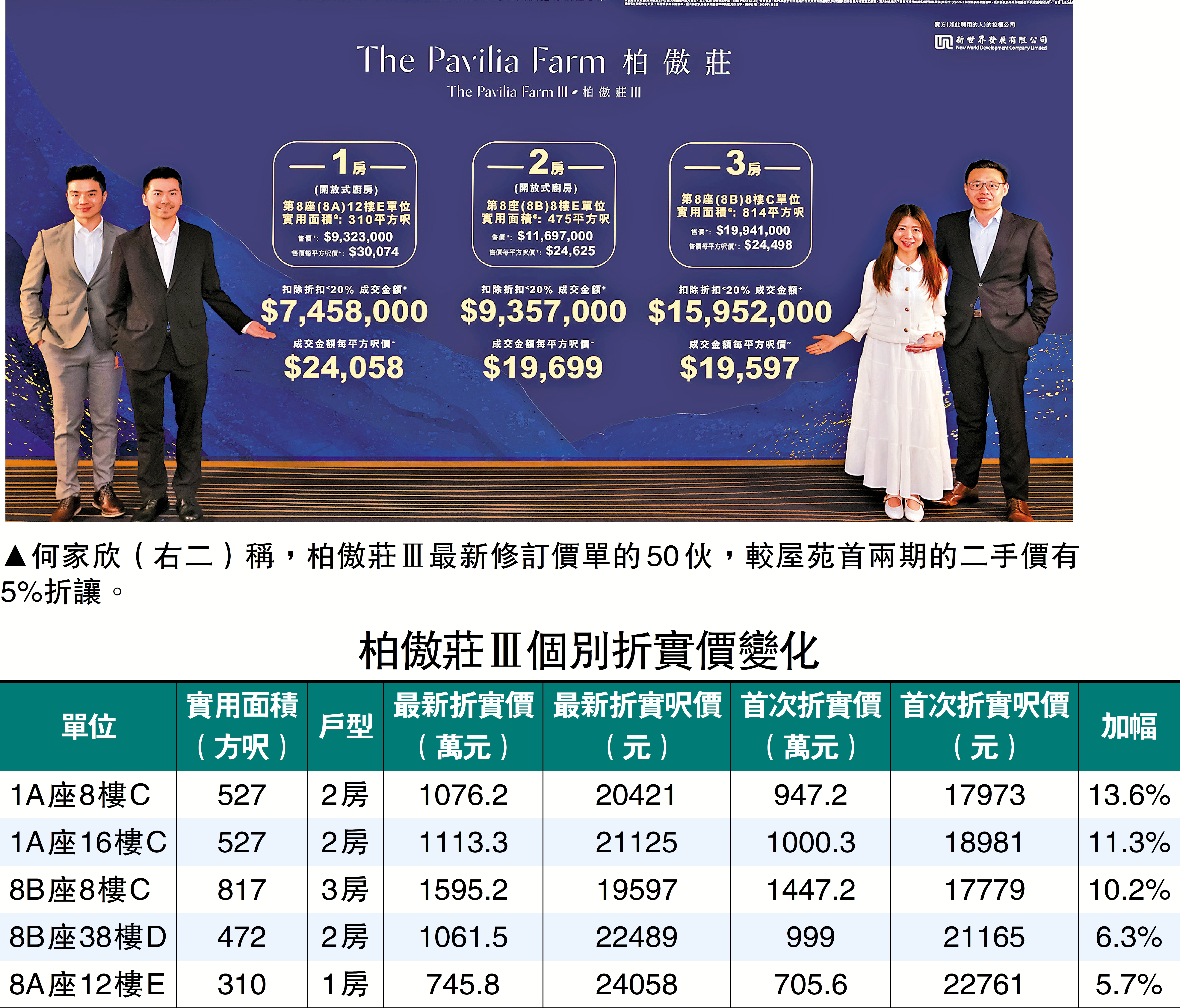 新世界發展營業及市務部總監何家欣表示,柏傲莊Ⅲ更新1A價單共50伙,包括11伙一房、25伙兩房及14伙三房單位,實用面積310至814方呎,樓價20%折扣額,折實745.8萬至1768.3萬元,折實呎價19597至25806元。