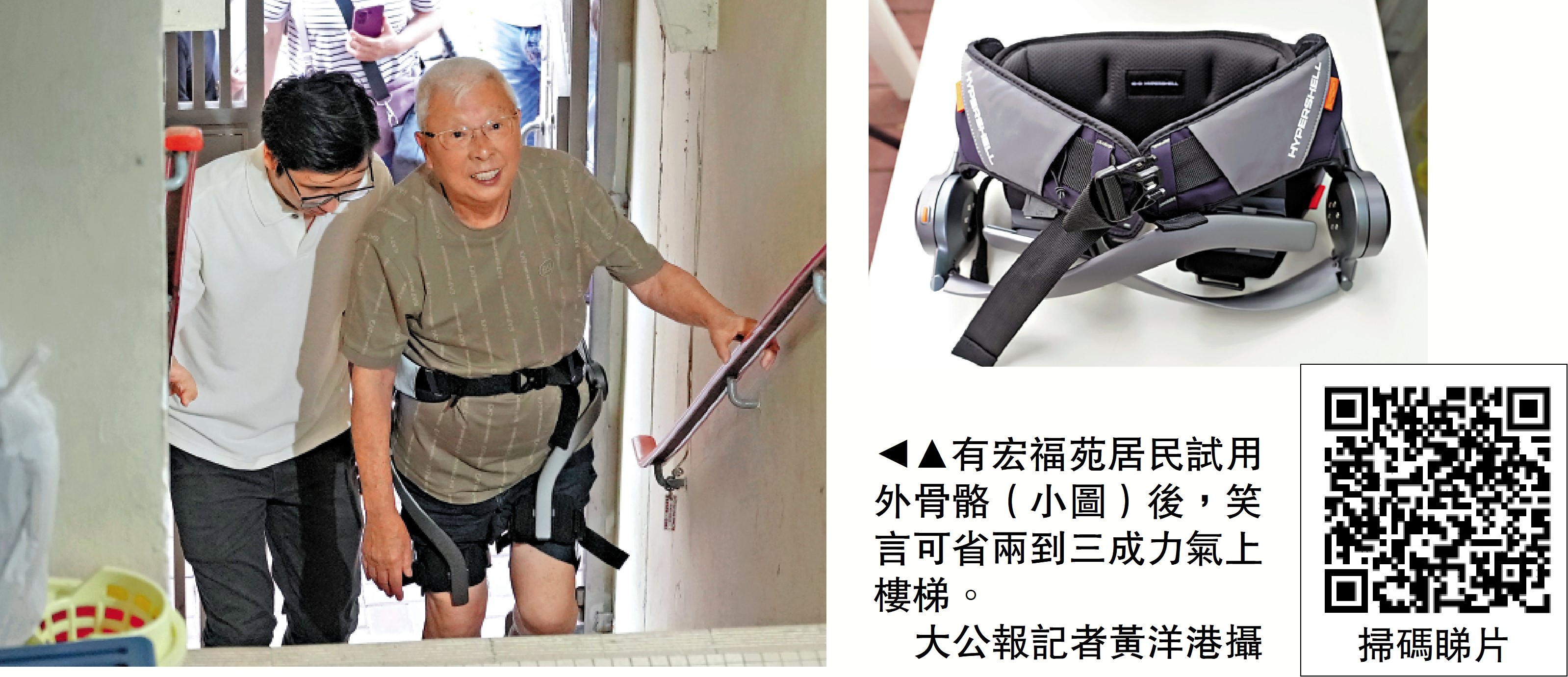 大公報記者昨日在宏福客廳親身體驗外骨骼。使用者可根據體形調節腰帶、腿帶,亦可根據實際需要調節不同模式,獲得不同程度的助力。記者在使用「舒適模式」時,只有上樓梯時能明顯感覺到助力。而使用「極限模式」時,即使行平路,也能感受到腿部被抬高,腿部彷彿輕了許多。