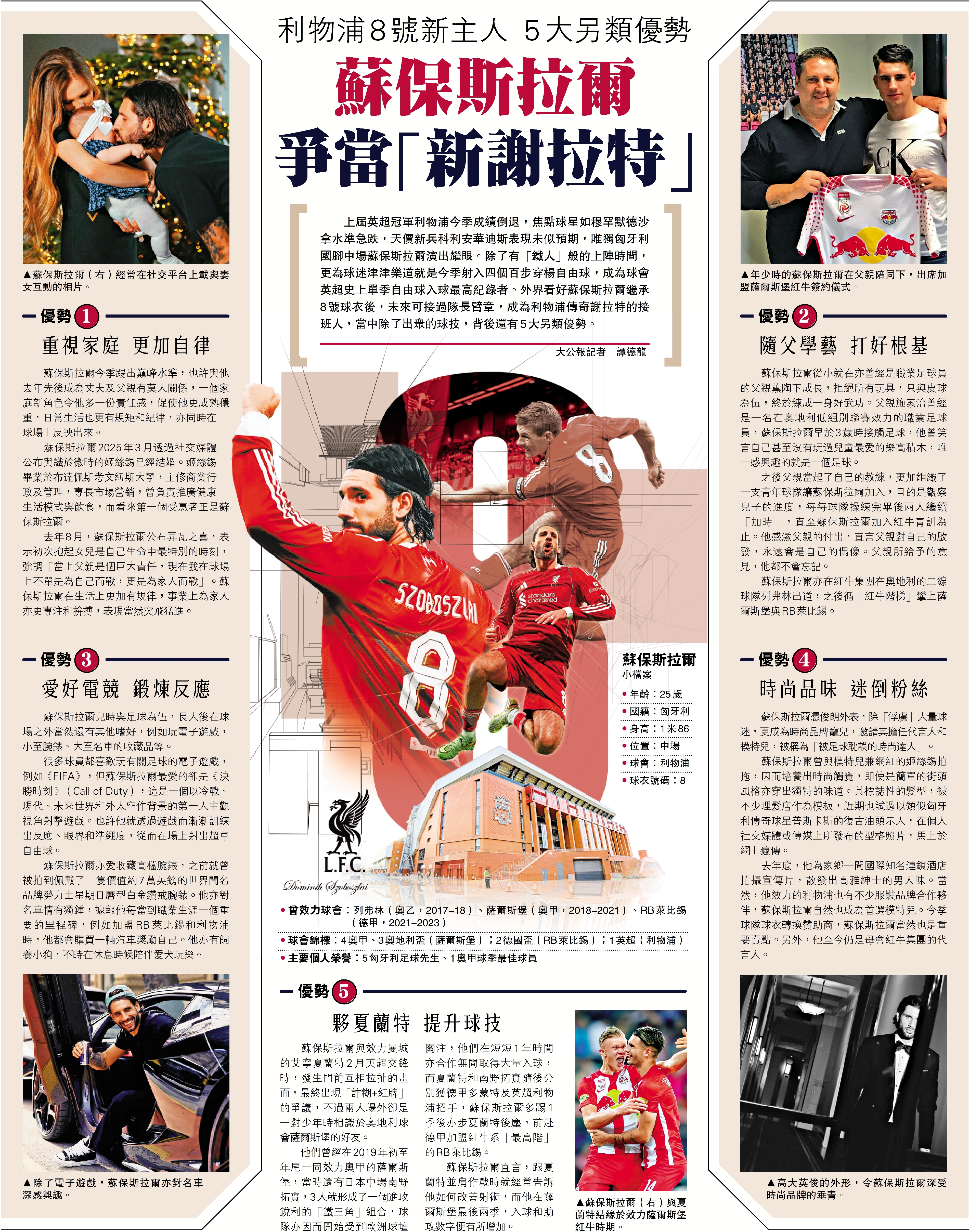 上屆英超冠軍利物浦今季成績倒退,焦點球星如穆罕默德沙拿水準急跌,天價新兵科利安華迪斯表現未似預期,唯獨匈牙利國腳中場蘇保斯拉爾演出耀眼。除了有「鐵人」般的上陣時間,更為球迷津津樂道就是今季射入四個百步穿楊自由球,成為球會英超史上單季自由球入球最高紀錄者。外界看好蘇保斯拉爾繼承8號球衣後,未來可接過隊長臂章,成為利物浦傳奇謝拉特的接班人,當中除了出眾的球技,背後還有5大另類優勢。\大公報記者 譚德龍