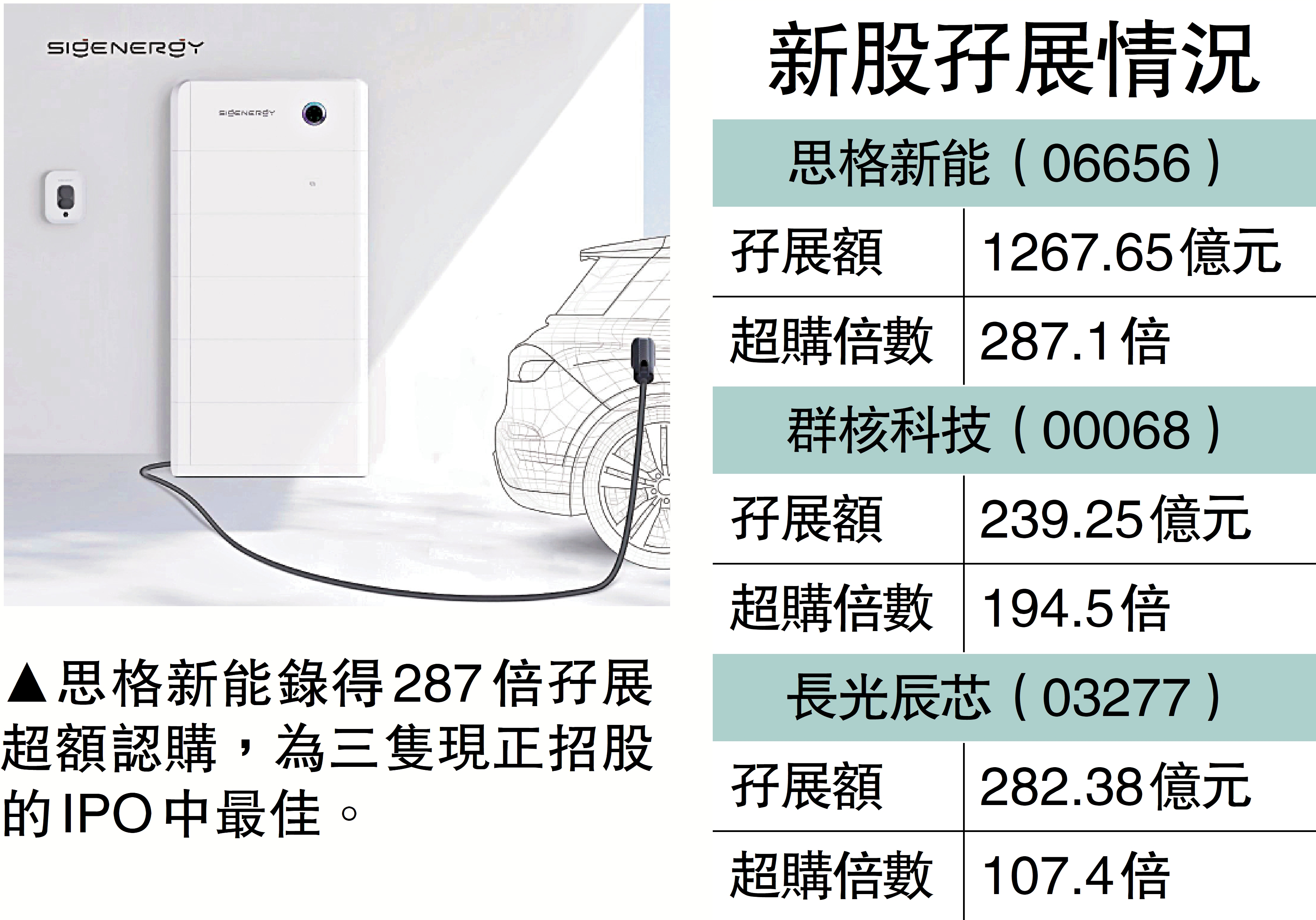 【大公報訊】新股市場氣氛火熱,三隻新股孖展申購額均突破百億元,超購逾百倍。其中分布式儲能系統(DESS)解決方案提供商思格新能(06656)市況最旺,首三日已取得1267.65億元孖展資金,以公開發售額4.4億元計,超額認購287.1倍。該公司招股期於下周一(13日)截止,下周四(16日)掛牌,中信証券(香港)和法國巴黎銀行為聯席保薦人。