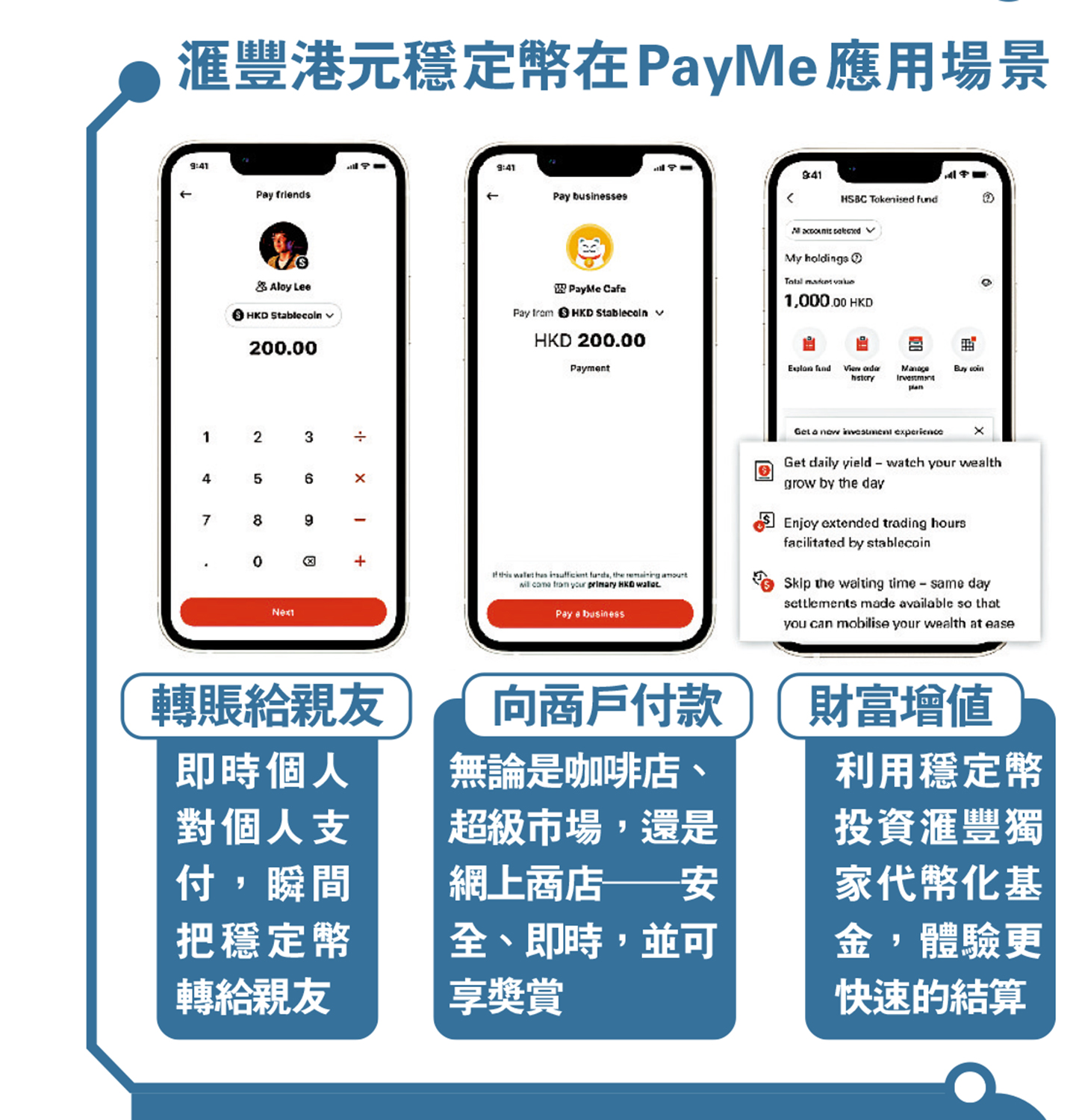 滙豐是本港最大型零售銀行,預計於2026年下半年推出港元穩定幣之後,將接入旗下兩個數碼平台,即PayMe和滙豐香港流動理財應用程式。在初步階段,將推出個人對個人(P2P)付款、個人對商戶(P2M)支付,以及代幣化投資等服務。