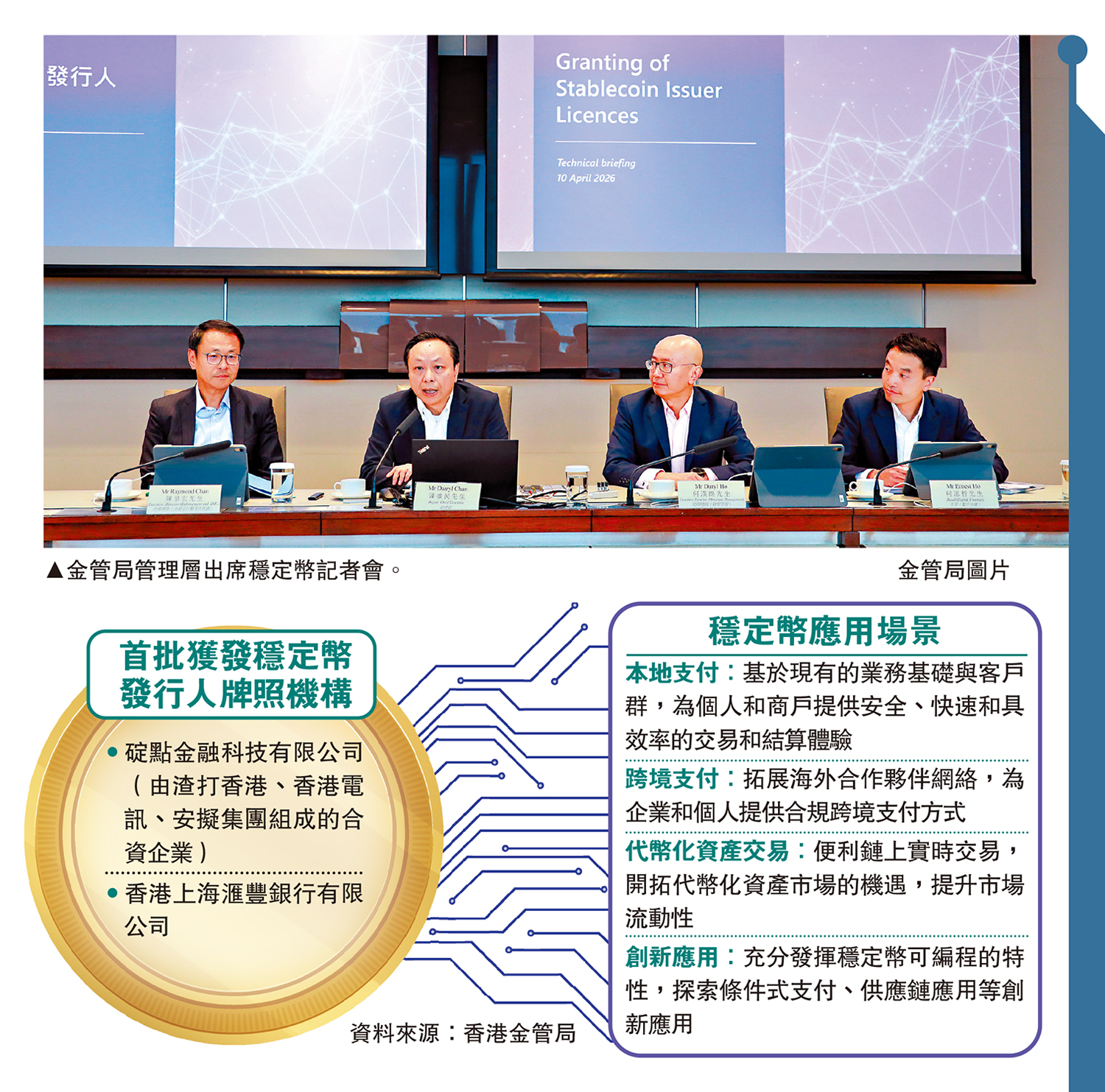 香港金融管理局昨日宣布,金融管理專員根據《穩定幣條例》,向兩家機構授予穩定幣發行人牌照,分別是渣打香港擁有控股權的碇點(Anchorpoint)金融科技有限公司,以及香港上海滙豐銀行有限公司,以在香港發行穩定幣。牌照由即日起生效。\大公報記者 黃裕慶