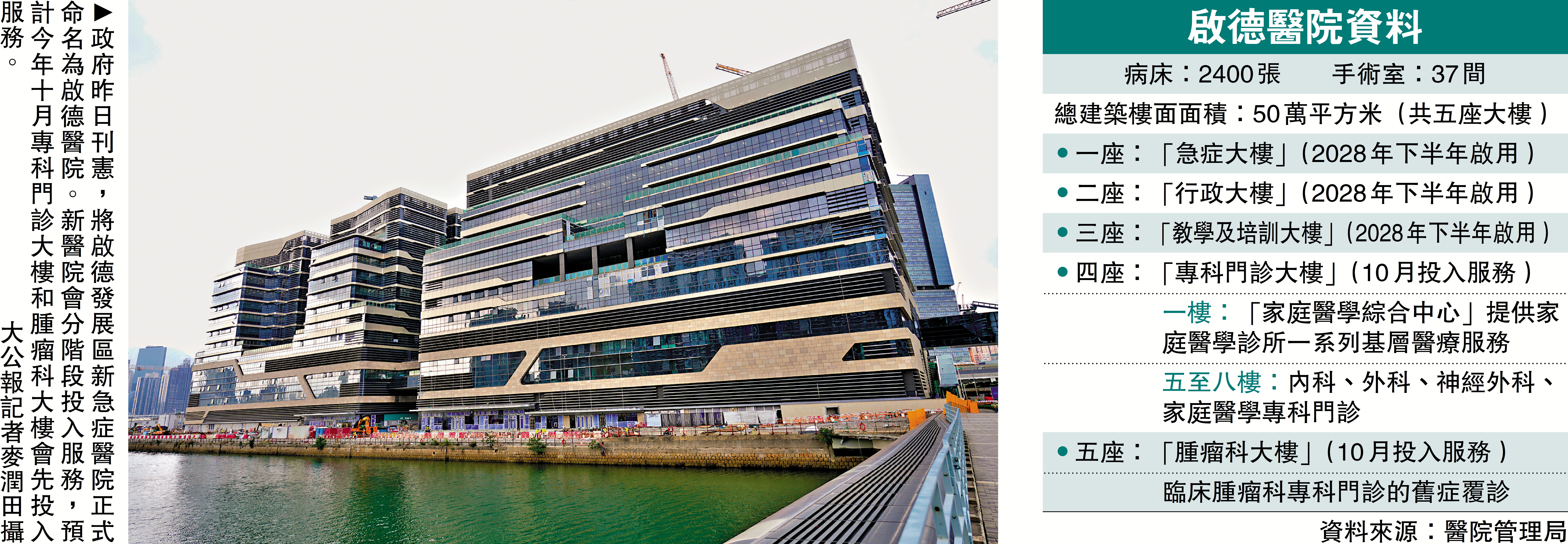 醫管局昨日公布,啟德醫院將於今年10月分階段投入服務,成為醫管局九龍中醫院聯網的「龍頭醫院」,亦將會是本港最大型的公立醫院,為九龍核心地帶逾180萬人口提供服務。啟德醫院將首先提供家庭醫學綜合中心、內科、外科、神經外科、腫瘤科舊症覆診等服務;住院、手術、急症室等主要臨床服務,將在2028年下半年展開。由於部分現於伊利沙伯醫院看診的病人,將轉至新醫院接受服務,醫管局強調,會確保搬遷不影響病人治療,若病人去錯伊院覆診,無需再前往新醫院,可由伊院駐診醫生看診,或由新醫院醫生遙距看診。\大公報記者 王亞毛