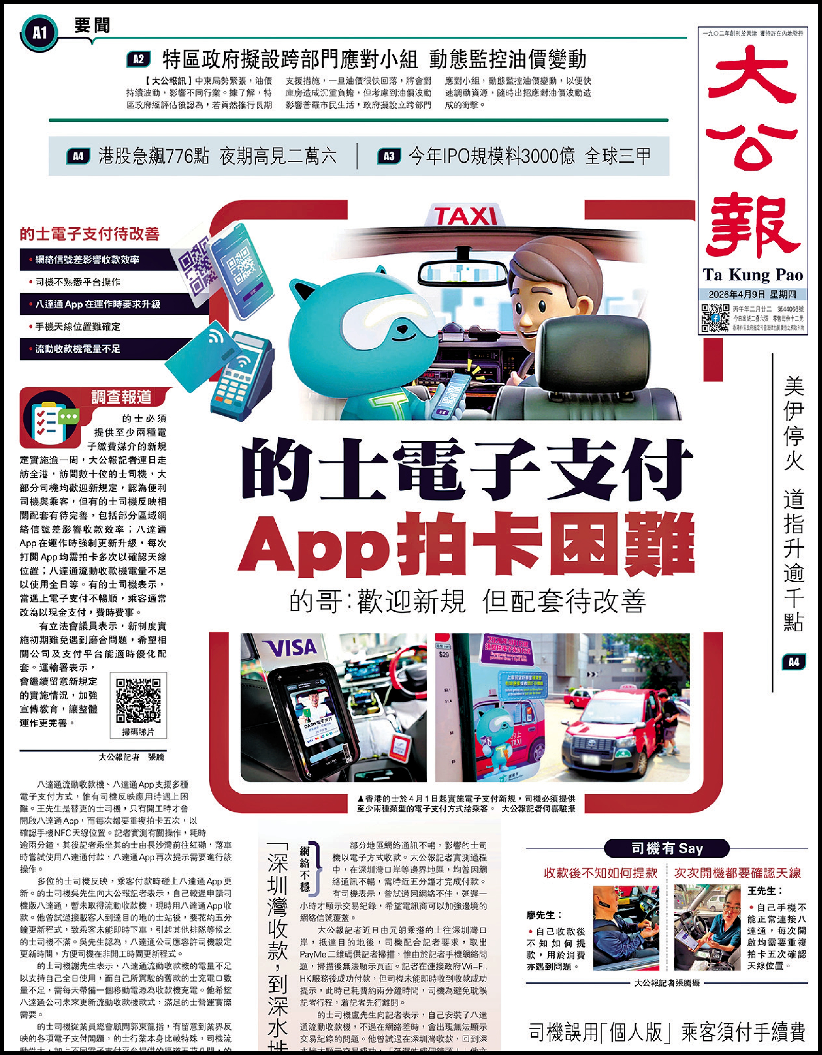 大公報記者於的士必須提供至少兩種電子繳費媒介的新規定實施後,早前連日走訪多區,訪問數十位的士司機,大部分司機均歡迎電子支付新規定,認為便利司機與乘客;但有的士司機反映相關配套有待完善,包括部分區域網絡信號差影響收款效率;八達通App在運作時強制更新升級,每次打開App均需拍卡多次以確認天線位置等。\大公報記者 鄭文迪