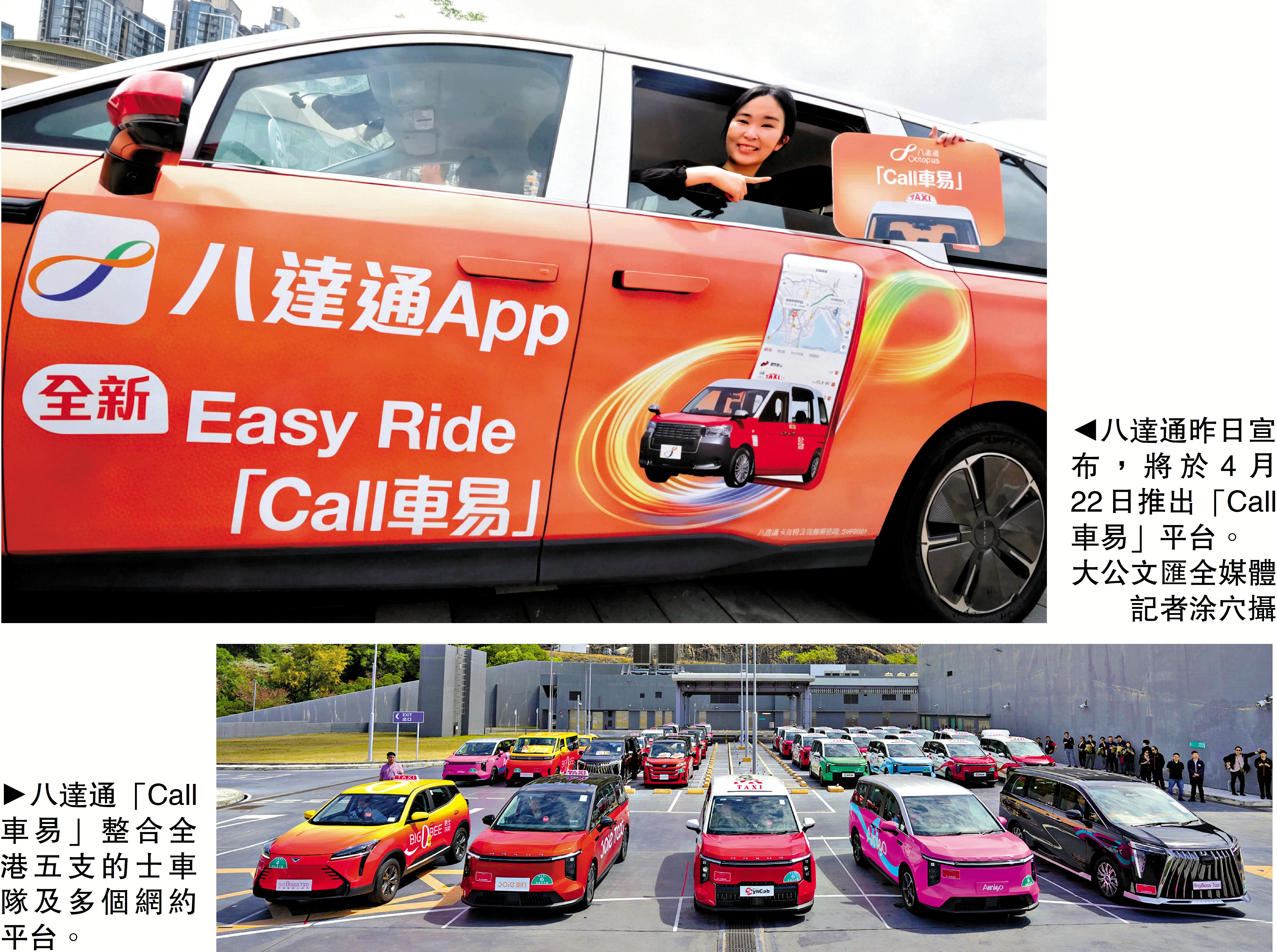 全港的士由4月1日起須提供至少兩種電子支付,香港電子支付龍頭八達通昨日宣布,將於4月22日推出「Call車易」平台,整合全港五支的士車隊、多個本地的士預約平台及其他提供無障礙車輛服務的社企平台等,覆蓋全港約8000輛的士,提供一站式預約服務,進一步推動本港智慧出行發展。