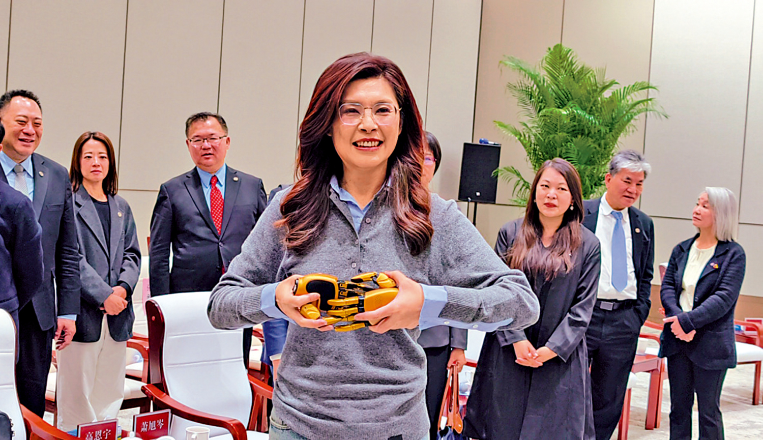 座談會結束後,鄭麗文雙手各持一隻金色靈巧手,將它們輕輕相握,臉上洋溢着愉悅的笑容,這飽含笑意的一幕,成為此次中關村之行的暖心片段,也象徵着兩岸科技交流的美好期許。\大公報記者朱燁