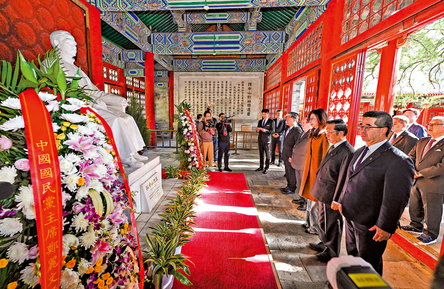 【大公報訊】記者朱燁北京報道:中國國民黨主席鄭麗文一行於11日上午赴北京西郊香山碧雲寺,拜謁國民黨總理孫中山衣冠塚。鄭麗文一行前往紀念堂中的孫中山漢白玉全身塑像行三鞠躬禮,兩旁擺放的花圈緞帶上書寫「總理孫中山先生靈鑒」,落款「中國國民黨主席鄭麗文暨全體同志敬獻」。