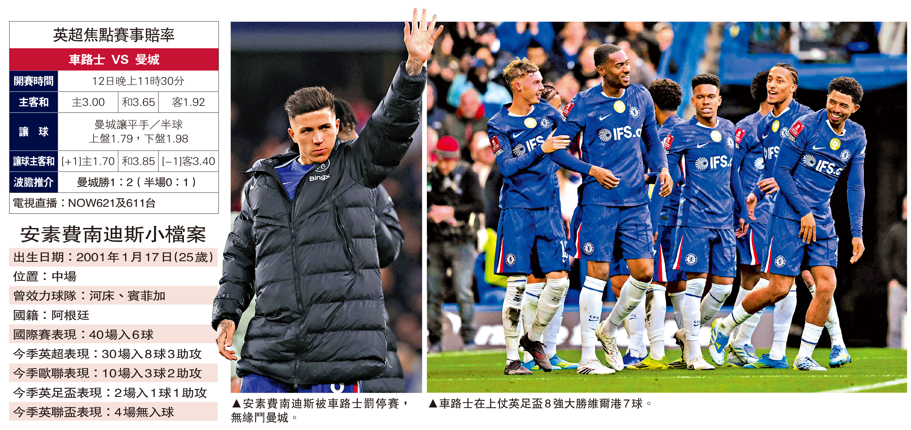 現時排名第6的車路士,今晚將對陣次席的「藍月亮」曼城,3分對雙方都至關重要。車路士要力爭前5,曼城則要追趕榜首阿仙奴。不過車路士表現飄忽,而曼城剛剛在英聯盃擊敗阿仙奴贏得錦標,狀態明顯較佳。讓球盤口曼城要讓平手/半球,上盤值得捧場。(NOW621、611台12日晚上11時30分直播)