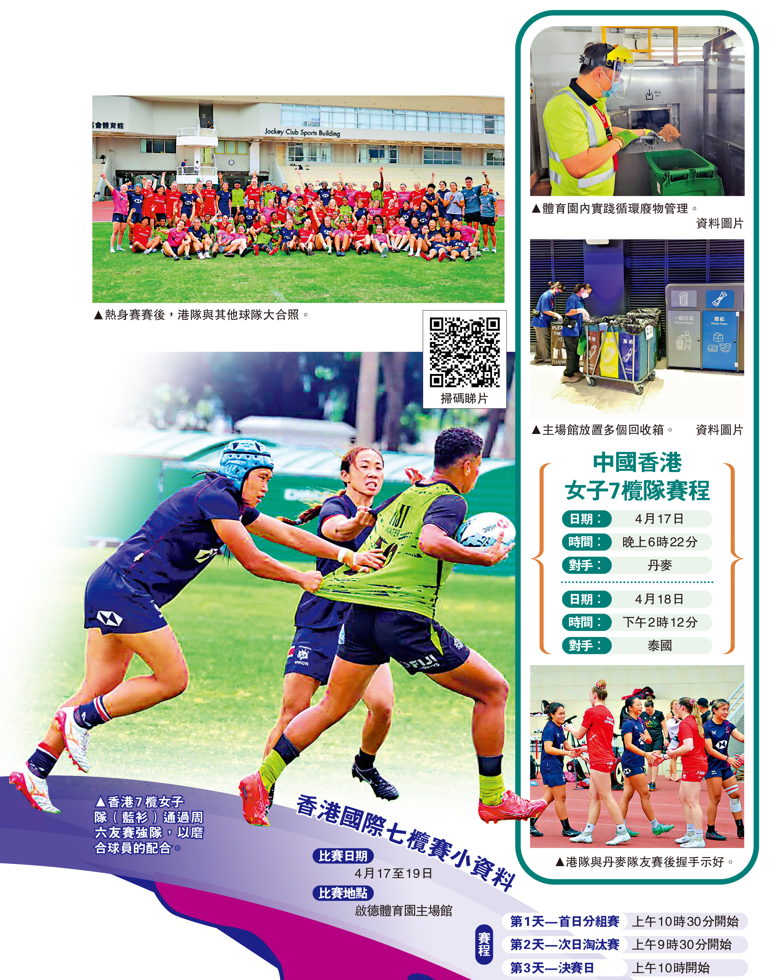 中國香港女子七人欖球隊11日在香港體育學院開操,備戰4月17至19日在啟德體育園主場館舉行的香港國際七人欖球賽。球隊昨與加拿大、斐濟及丹麥隊分別舉行熱身賽,除了磨合球隊配合、試驗新陣容之外,亦對各參賽球隊的實力加深了解。港隊成員莊嘉欣表示,雖然丹麥隊身體素質強,但對港隊取勝抱有信心,期待能再次衛冕銀劍賽冠軍;隊友苗頌雅則期待首次在啟德主場館出戰賽事,力爭為隊伍取得佳績。\大公報記者 朱家立(文、圖)