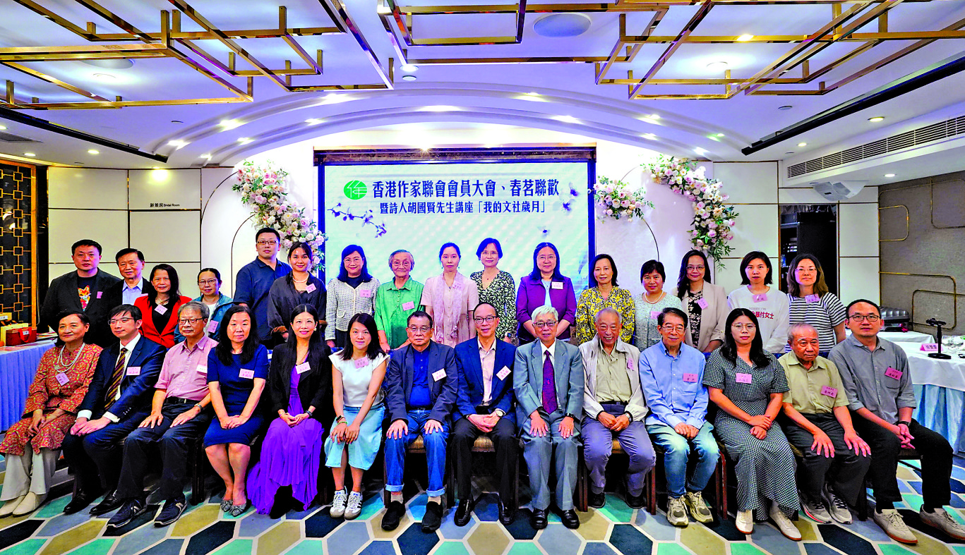 【大公報訊】大公文匯全媒體記者丁寧報道:香港作家聯會會員大會、春茗聯歡暨詩人胡國賢講座「我的文社歲月」於昨晚在炮台山彩福喜宴舉行。出席大會主要嘉賓包括:中聯辦宣文部處長謝李韜,中國文學藝術界聯合會香港會員總會會長、港區全國人大代表馬逢國,香港詩人胡國賢,嶺南大學協理副校長李東輝,嗇色園董事會副主席、香港作家聯會顧問律師姚嘉棟,三聯書店(香港)有限公司董事及總編輯于克凌,中華書局(香港)有限公司董事周建華,香港中和出版有限公司總經理兼總編輯陳鳴華,香港中國旅遊出版社長、《香港文學》社長李國紅,作曲作詞人韋然、黃彩屏伉儷,畫家沈平,油畫家林鳴崗等,以及香港作家聯會會長潘耀明,執行會長羅光萍等及一眾常務理事、理事。