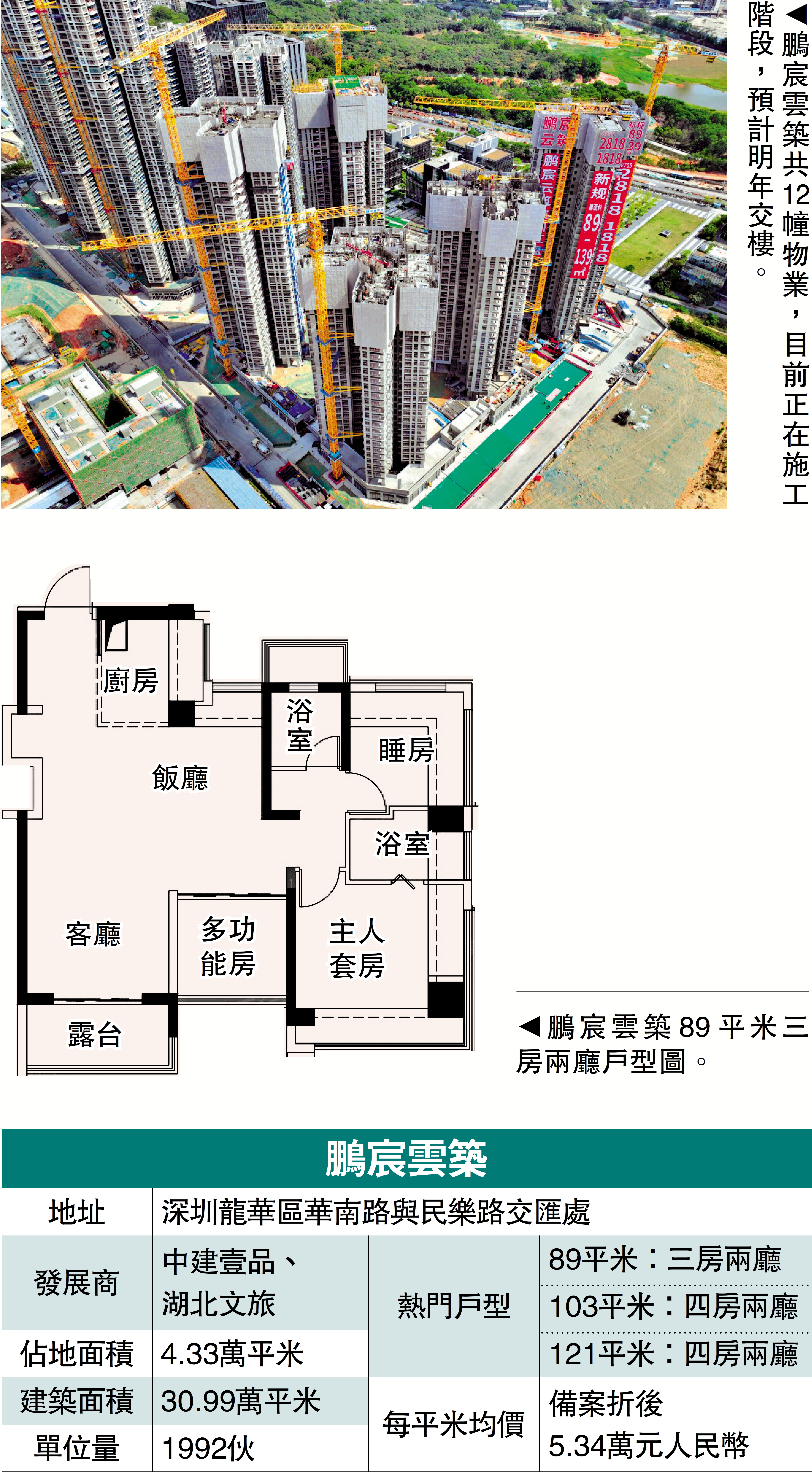 龍華區民治街道新盤鵬宸雲築11號樓獲預售許可證,預計短期內開售。本次加推252伙,備案每平米均價約6.14萬元(人民幣,下同),折後均價約5.34萬元(約6.1萬港元)。入門級的89平米戶型入場費約440萬元起,103平米戶型由約531萬元起。