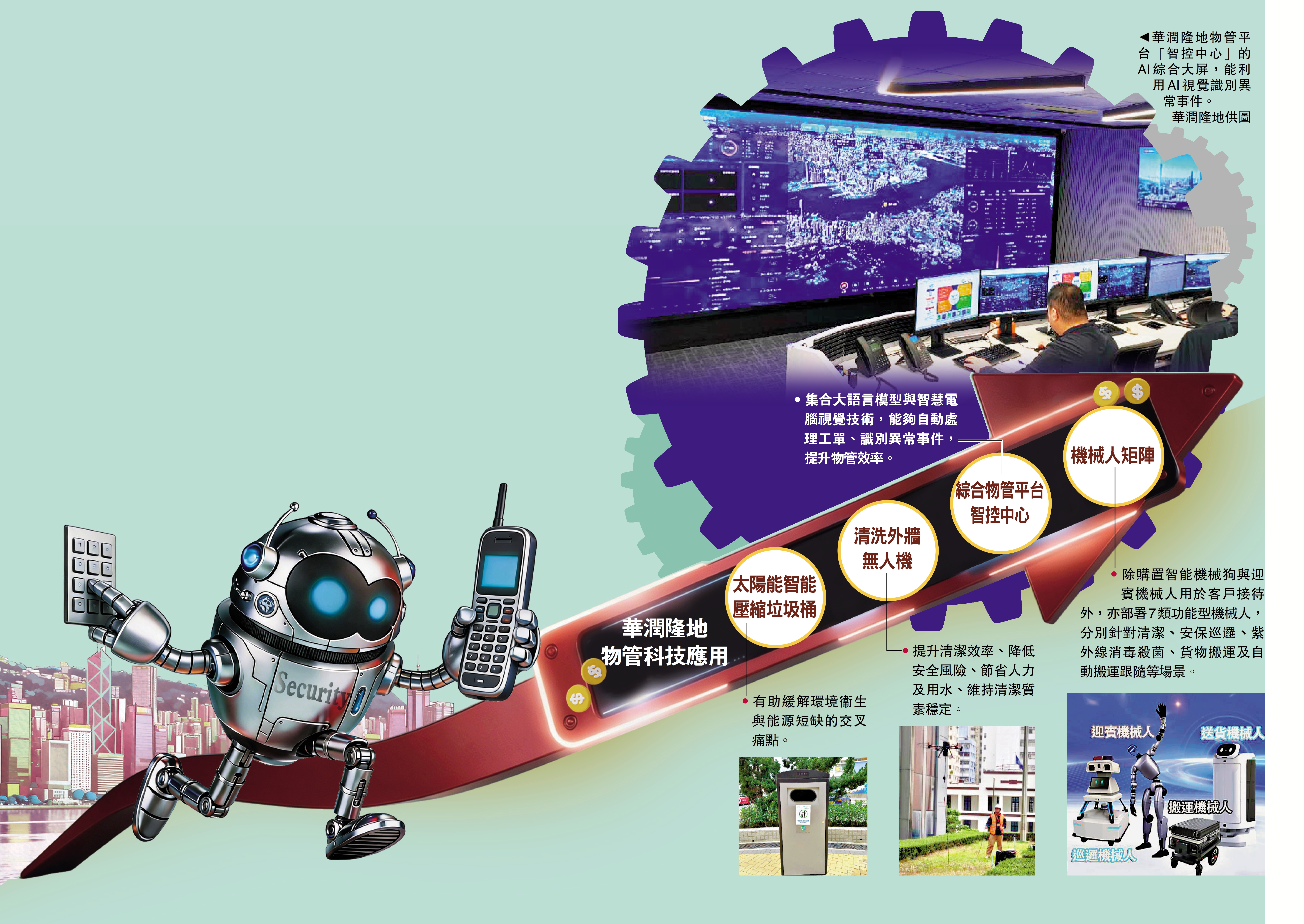 今年政府工作報告首次提出「打造智能經濟新形態」,目標是要推動重點行業領域人工智能(AI)規模化應用。華潤隆地綜合物管平台總經理張玉龍向《大公報》表示,當前香港物業管理行業正全面擁抱PropTech(地產科技),並經歷從「勞動力密集」向「新質生產力」跨越的歷史性時刻。他指出,人工智能有助行業提質增效,賦能社區基礎設施,以及加強火警風險監控,公司未來將繼續借助AI解放人力,更好服務社區。\大公報記者 蔣去悄
