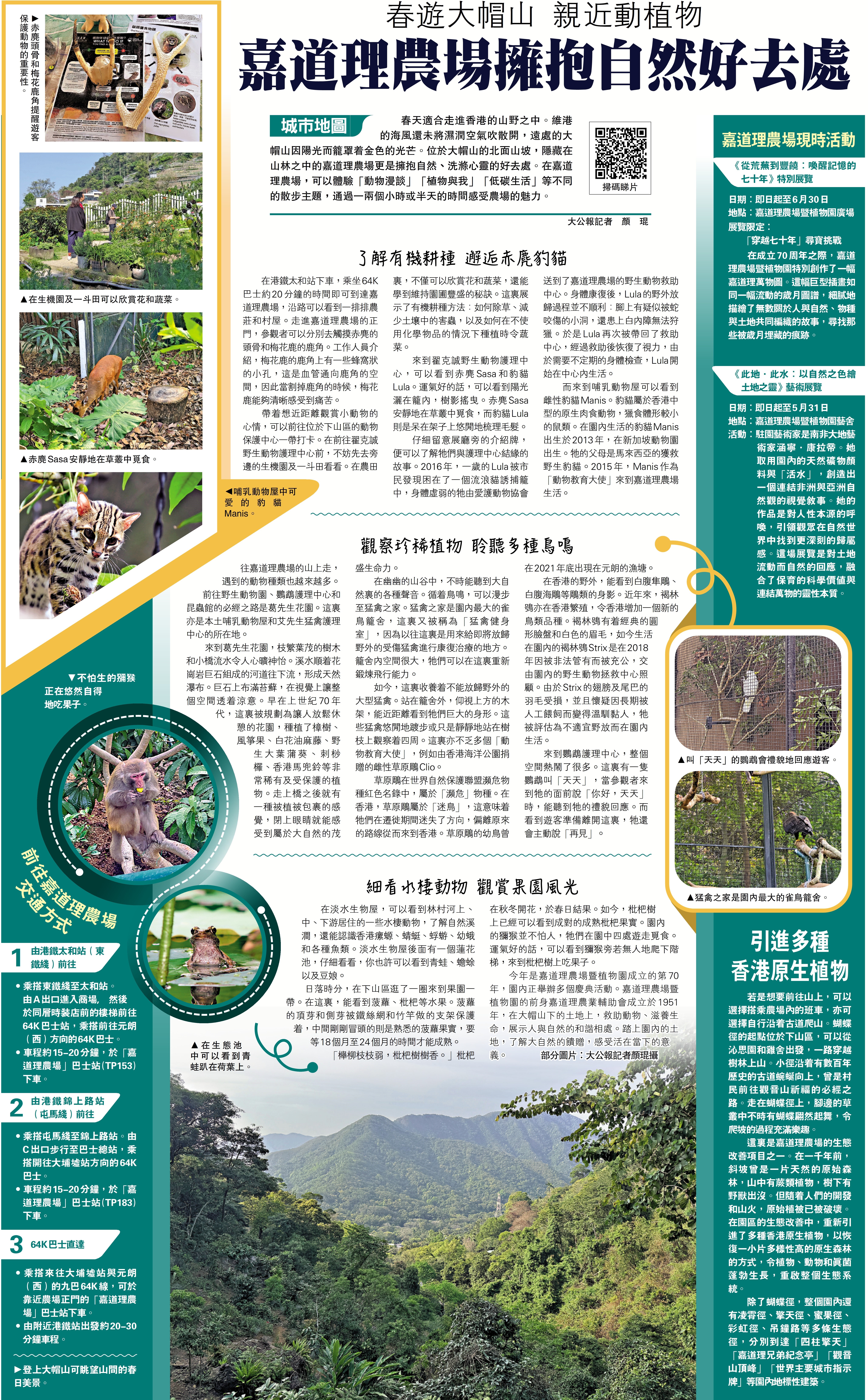 春天適合走進香港的山野之中。維港的海風還未將濕潤空氣吹散開,遠處的大帽山因陽光而籠罩着金色的光芒。位於大帽山的北面山坡,隱藏在山林之中的嘉道理農場更是擁抱自然、洗滌心靈的好去處。在嘉道理農場,可以體驗「動物漫談」「植物與我」「低碳生活」等不同的散步主題,通過一兩個小時或半天的時間感受農場的魅力。\大公報記者 顏 琨