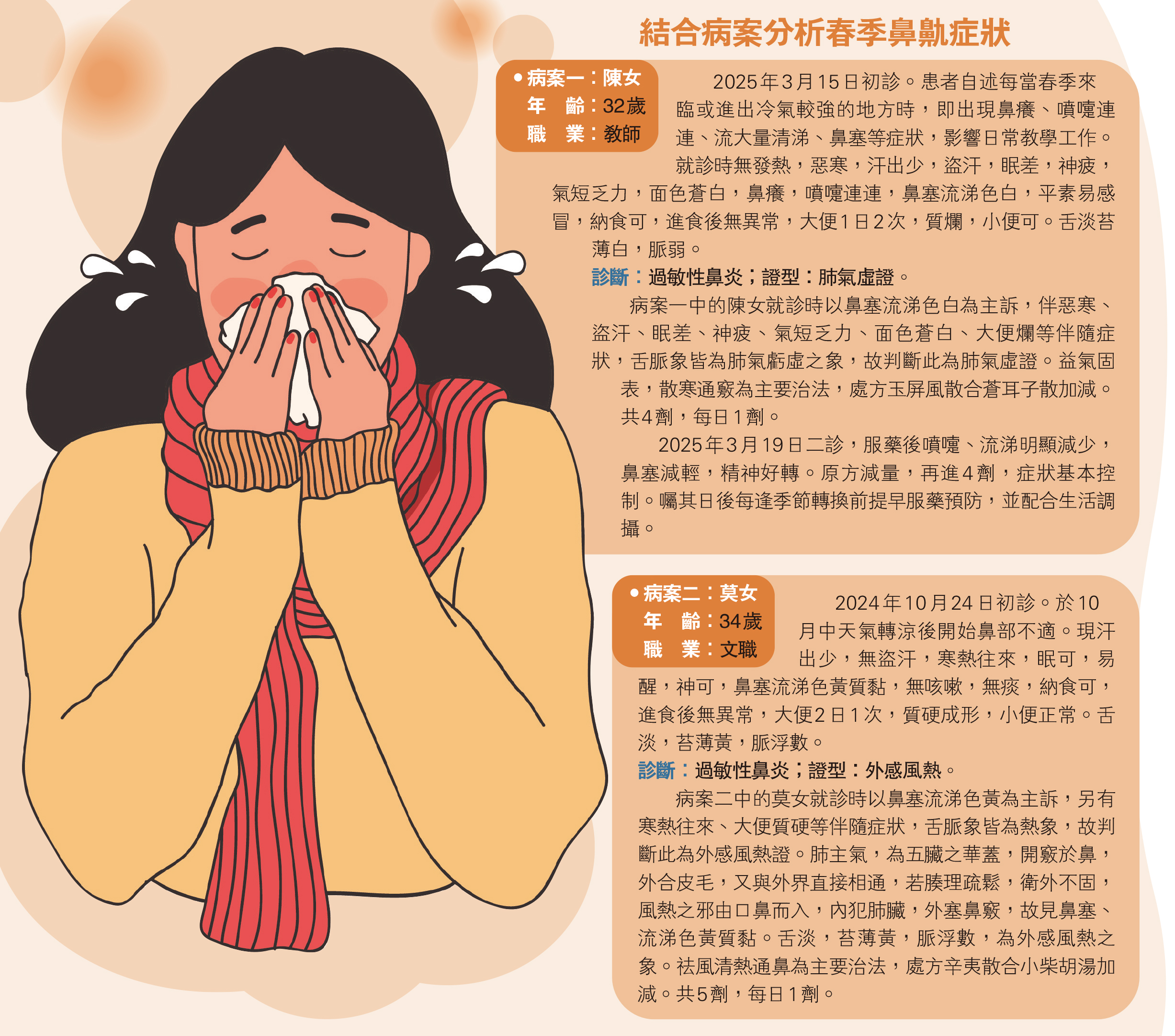 2025年3月19日二診,服藥後噴嚏、流涕明顯減少,鼻塞減輕,精神好轉。原方減量,再進4劑,症狀基本控制。囑其日後每逢季節轉換前提早服藥預防,並配合生活調攝。