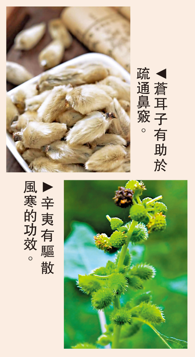 蒼耳子散屬於中醫方劑學中的解表劑,主要由蒼耳子、辛夷花、白芷、薄荷葉所組成。方中的君藥為蒼耳子、辛夷,兩藥疏散風邪,上通鼻竅;臣藥為白芷,祛風通竅,疏散頭部及面部風邪而止痛;佐藥為薄荷疏散風熱,清利頭目。