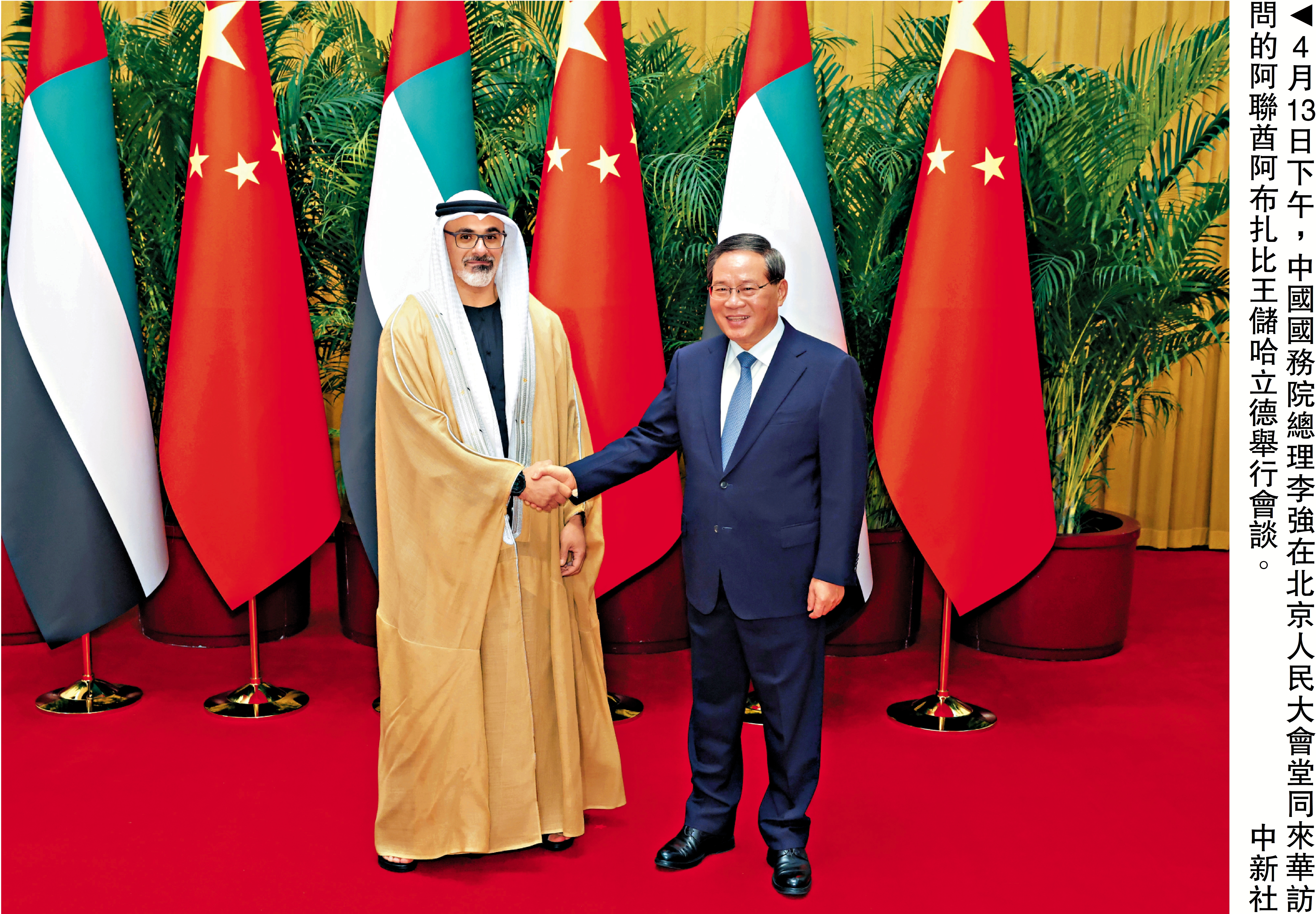 【大公報訊】據新華社報道:4月13日下午,國務院總理李強在北京人民大會堂同來華訪問的阿聯酋阿布扎比王儲哈立德舉行會談。