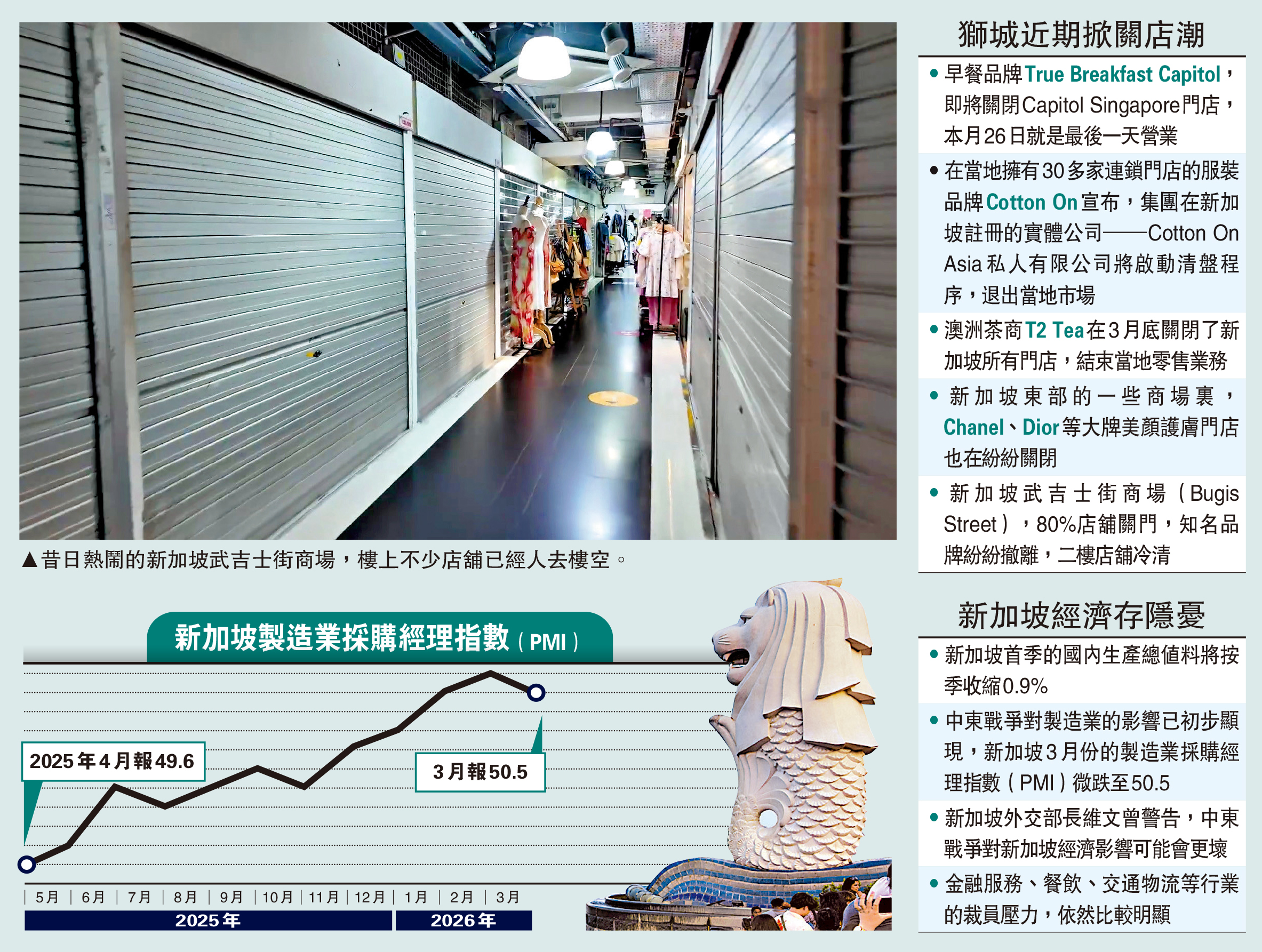 昔日熱鬧的新加坡武吉士街商場(Bugis Street),80%店舖關門,知名品牌紛紛撤離,二樓店舖冷清清。事實上,曾經是新加坡潮人地標的武吉士街沒落、其他大小商戶的經營環境又日益困難;再加上中東戰爭推高通脹的影響,這股從餐飲業而起的寒流,已經蔓延到了其他行業,新加坡經濟或已陷入斷崖式的危機。\大公報記者 柴進