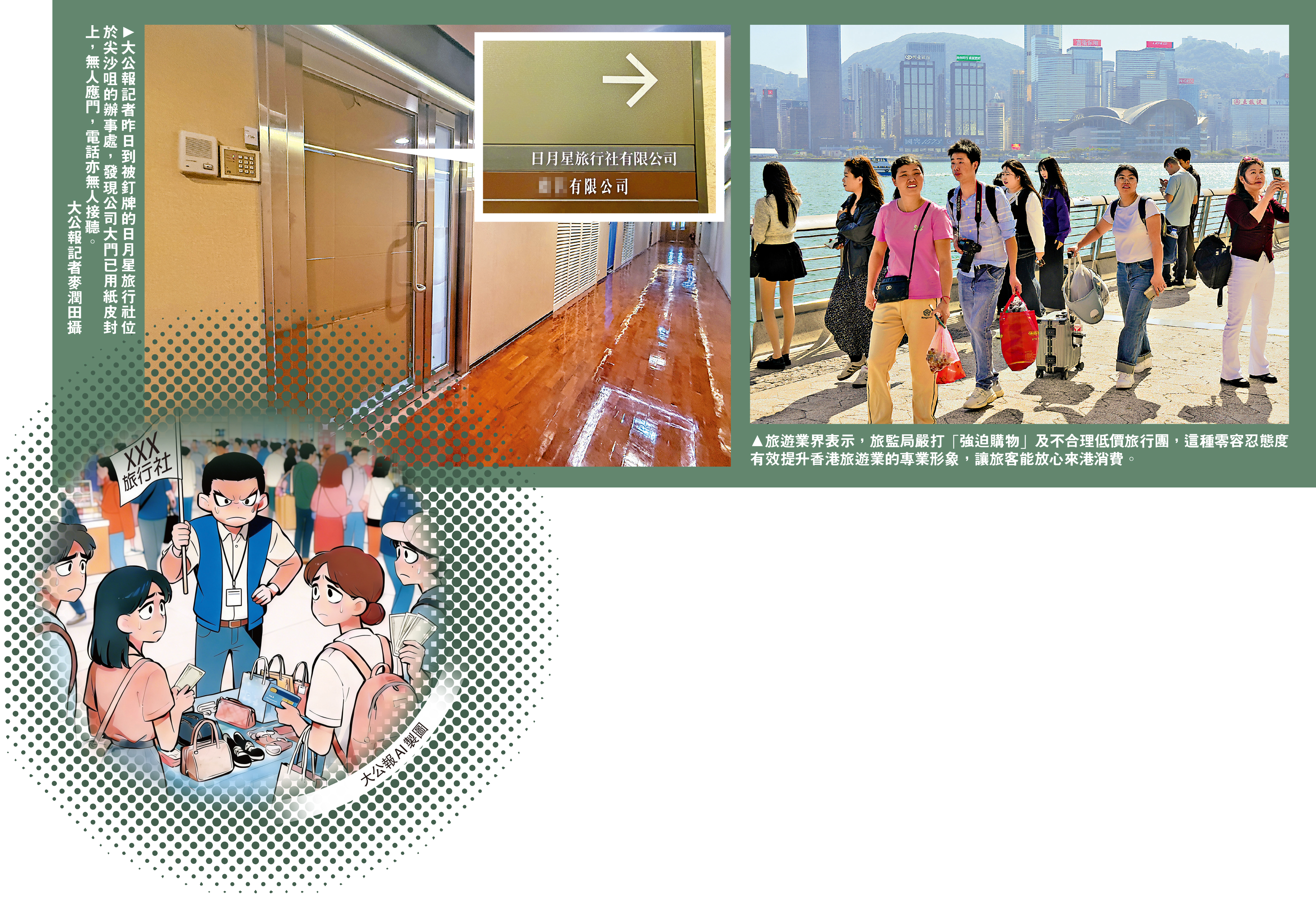 涉事的日月星旅行社位於尖沙咀漢口中心,大公報記者昨日下午走訪發現,該公司沒有招牌,但同層水牌仍有標示,玻璃正門已用紙皮和紙張完全封住,透過紙張縫隙可知內裏仍亮燈,惟記者按門鈴無人應答,撥打旅行社電話亦未有人接聽。大廈的保安員稱,該旅行社平時會有人出入,惟未知其發生何事。