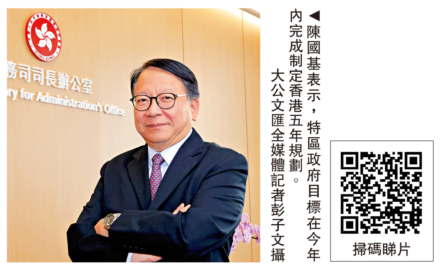明日(15日)是第十一個「全民國家安全教育日」,今年活動主題是「主動對接『十五五』規劃 堅持統籌發展和安全」。香港特區政府政務司司長陳國基近日接受香港大公文匯傳媒集團訪問時強調,特區政府正全速編制香港五年規劃,目標在今年內完成制定,為香港發展確立清晰實在的路徑。他特別提醒社會各界:「國家安全風險仍然存在,隨時可能突然出現,千萬不能『好了傷疤忘了痛』,不能忘記2019年的慘痛經歷和沉痛教訓。」\大公文匯全媒體記者 黃子龍
