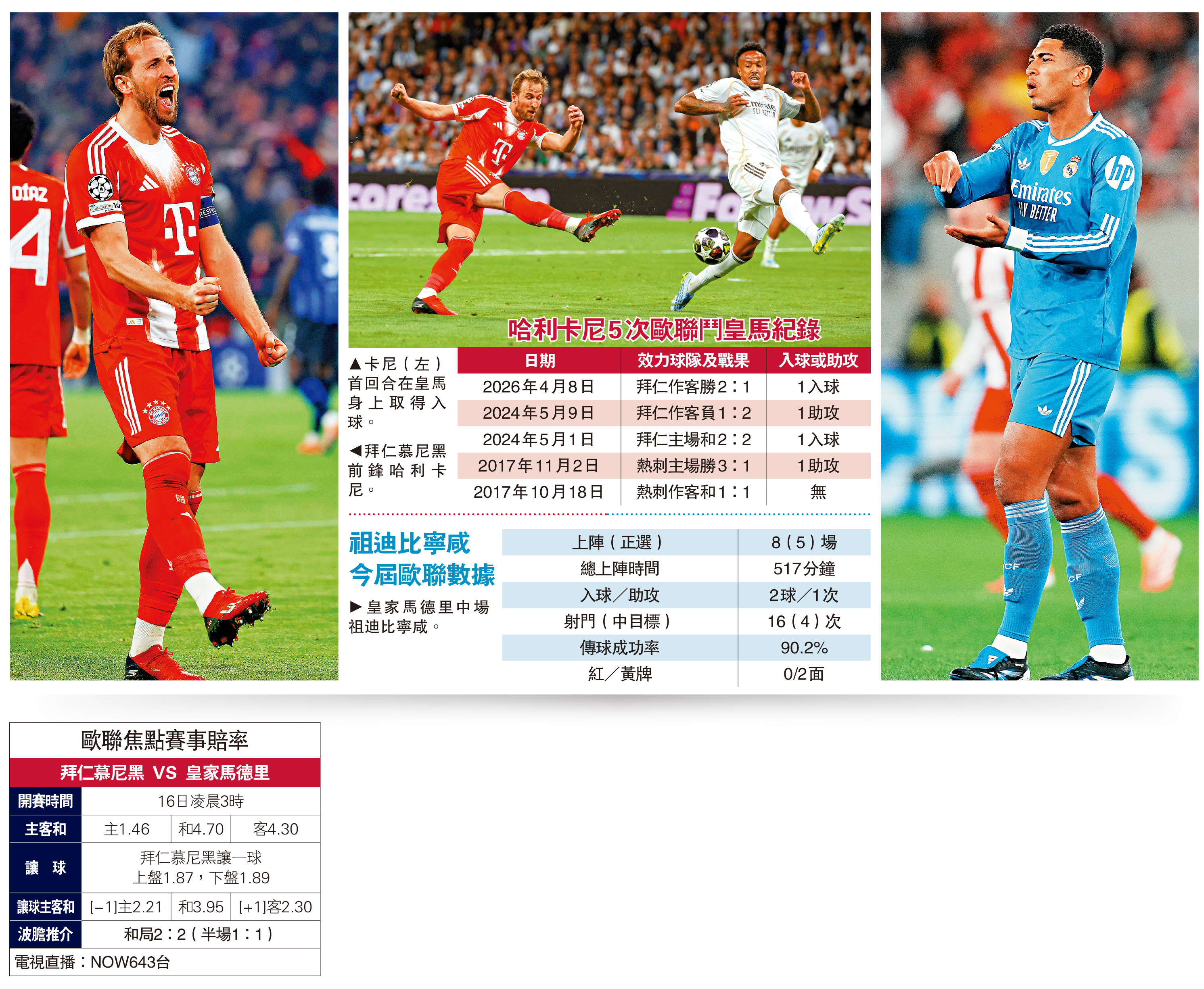 拜仁慕尼黑射手哈利卡尼與皇家馬德里進攻中場祖迪比寧咸,在夏天合力為英格蘭爭取世界盃之前,先在香港時間16日凌晨歐聯8強次回合各為其主決一高下;首回合射入1球的卡尼,連同之前效力熱刺時曾經5次與皇馬對壘,當中4場有入球或助攻,要算是皇馬「剋星」,而比寧咸首回合下半場以後備入替後,皇馬立即扭轉劣勢,球隊關鍵地追成1:2的入球正是始於其策動的攻勢,由另一名英兵阿歷山大阿諾特「靚傳中」助攻,今次誰勝誰敗,也許還看英格蘭球員。\大公報記者 譚德龍