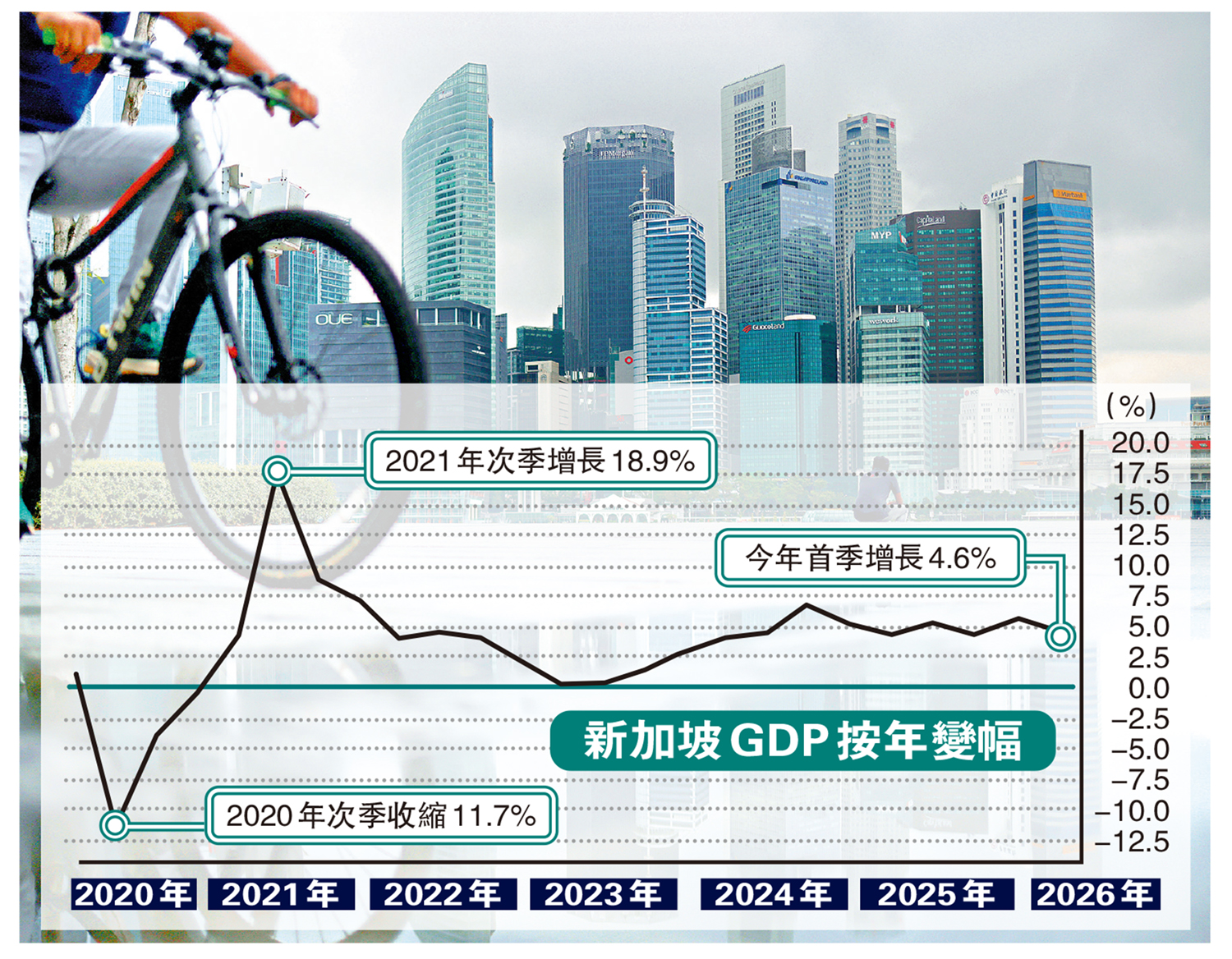 【大公報訊】新加坡首季國內生產總值(GDP)增4.6%,遜於市場預期的5.8%,按季更錄收縮0.3%。該國央行上調今年核心消費物價指數(CPI)預測,並一如市場預期宣布收緊銀根,上調匯率區間斜率,以應對油價帶來的通脹。