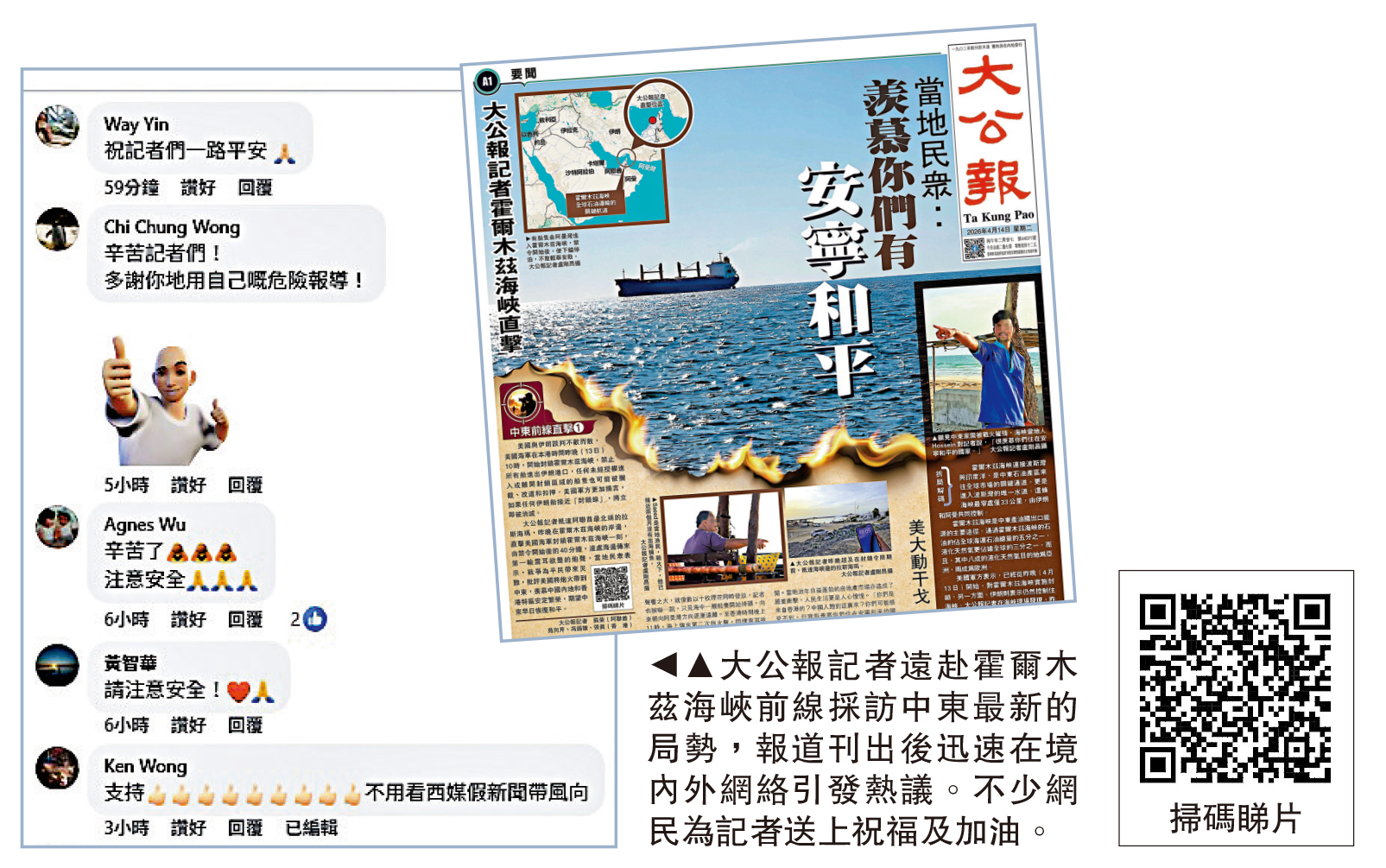 綜合網民留言,普遍讚揚大公報記者勇毅專業,深入險境堅守新聞現場,展現媒體的責任與擔當,大量留言叮囑記者注意安全。有網民表示,安定生活並非必然,香港的穩定與安寧來之不易。與此同時,輿論亦關注霍爾木茲海峽封鎖對全球航運、油氣價格的影響,以及地緣衝突對普通民眾生活的衝擊。