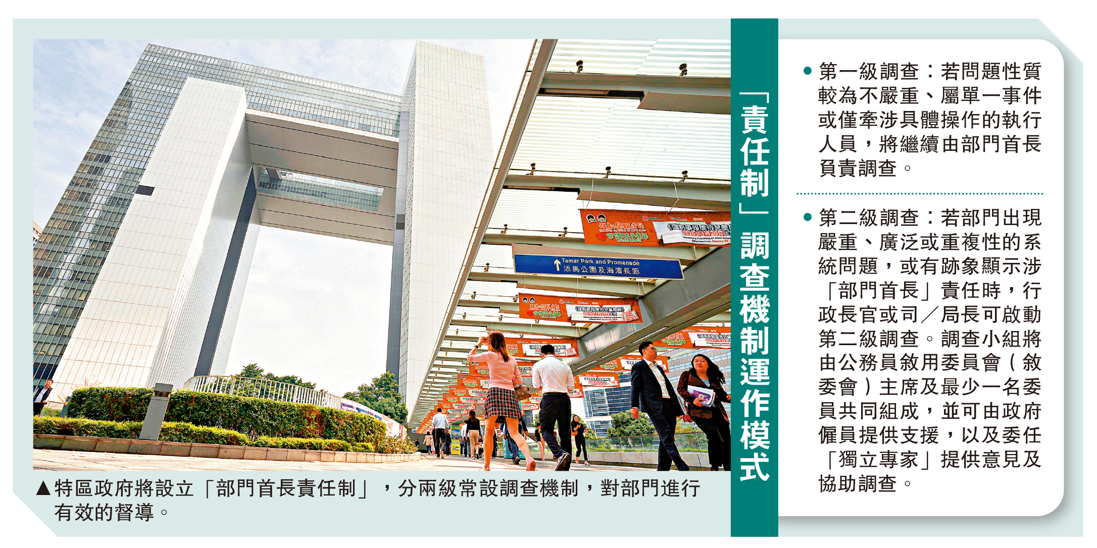 據介紹,「責任制」將按部門問題的嚴重性訂立兩級常設調查機制,當部門出現問題時,能公平、公正地進行調查,查找不足並釐清責任誰屬,達至持續提升部門的整體管理水平和政府的管治效能。若問題性質較為不嚴重、屬單一事件,以及牽涉負責具體操作的執行人員,將由部門首長負責進行第一級調查。