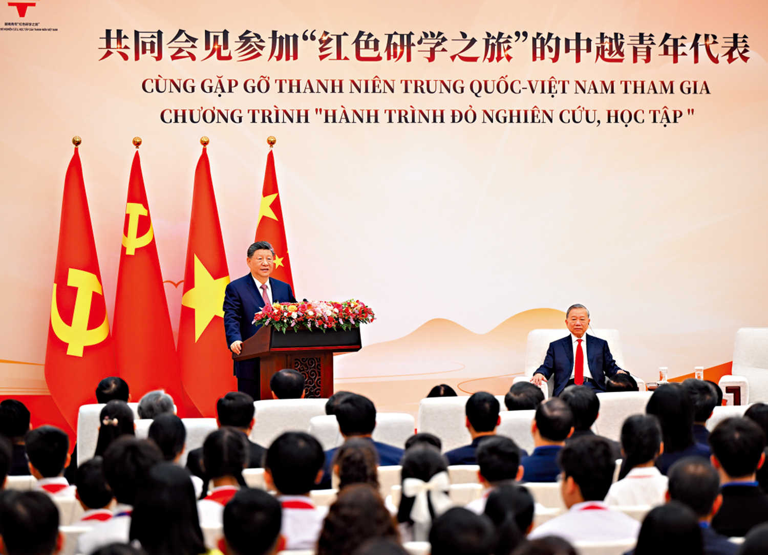 習近平表示,去年我和蘇林總書記一道啟動「紅色研學之旅」項目,一年來,兩國青年共同探尋中越友好的紅色基因,感受中國式現代化的萬千氣象,在中國各地留下許多互學互鑒、相知相親的生動故事。中越友好的未來在青年,我相信中越青年一定能夠勇做兩國世代友好的傳承者和接班人,我們共同的事業一定能夠不斷地興旺發達。