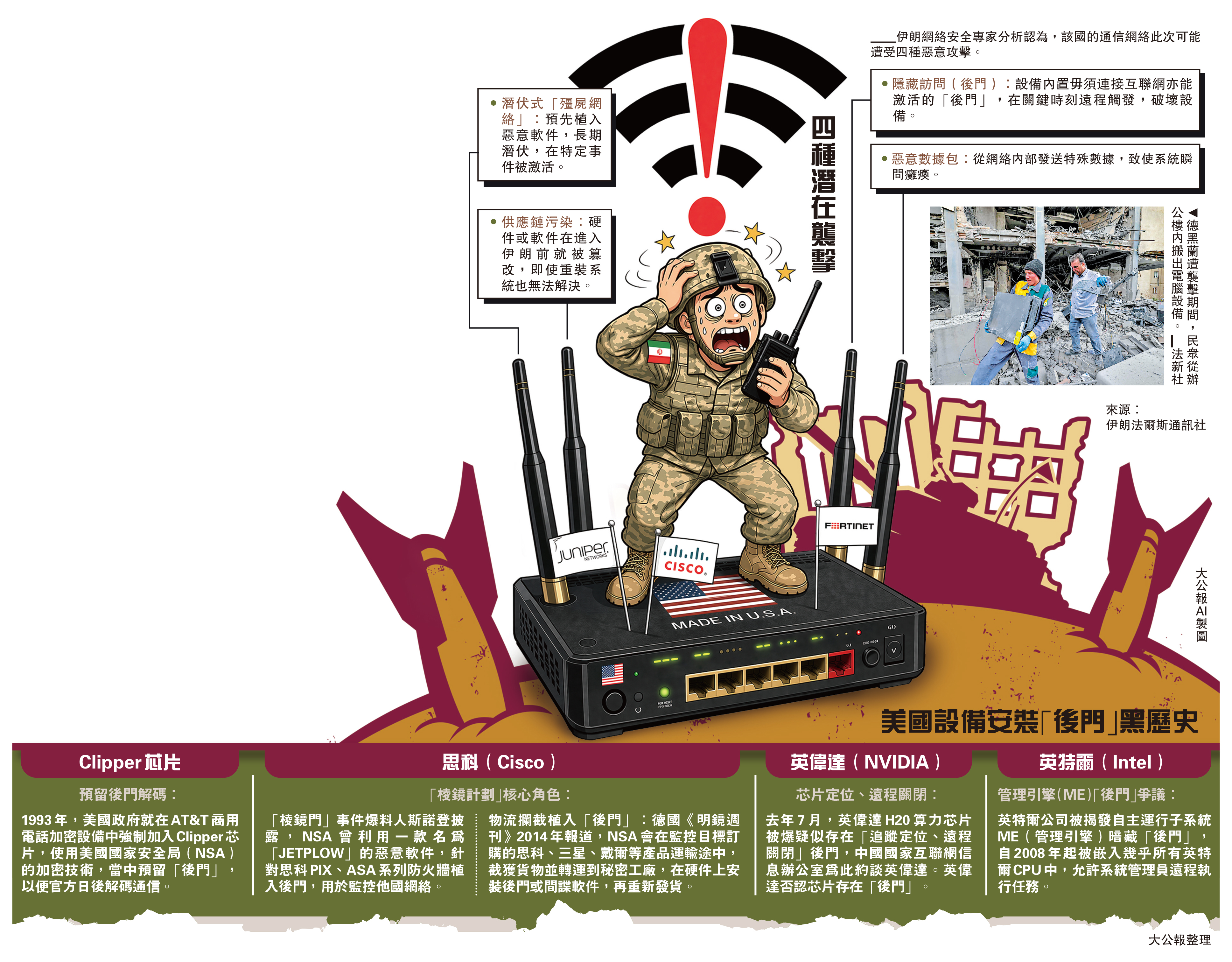 物流攔截植入「後門」:德國《明鏡週刊》2014年報道,NSA會在監控目標訂購的思科、三星、戴爾等產品運輸途中,截獲貨物並轉運到秘密工廠,在硬件上安裝後門或間諜軟件,再重新發貨。