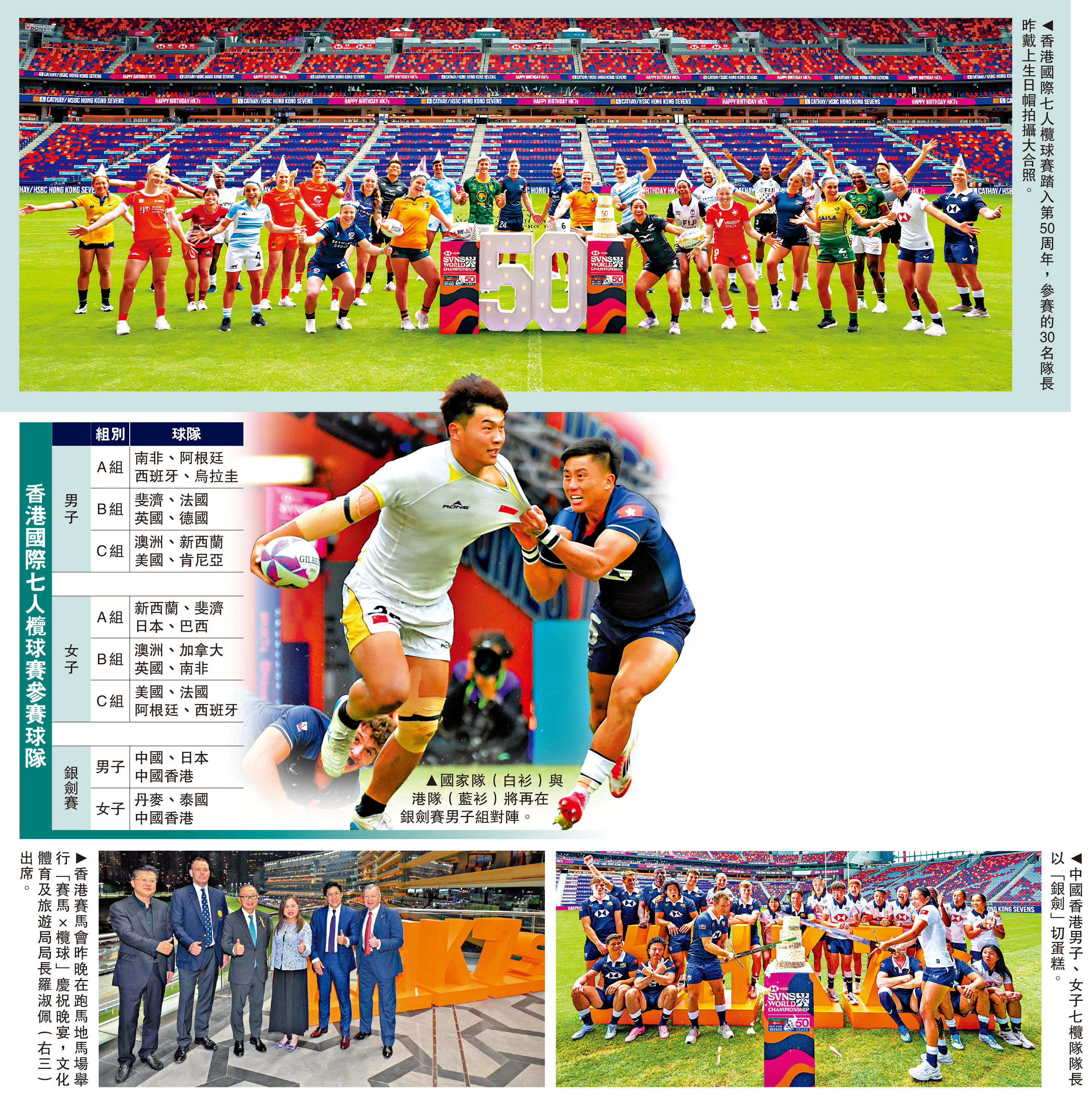 本屆七欖賽踏入第50周年,適逢金禧,賽會昨特別安排出席的30名隊長戴上生日帽拍攝大合照,並備有蛋糕慶祝。其中爭取銀劍賽3連冠的港男隊隊長之一拜恩塞巴與港女隊隊長陳穎,更以象徵銀劍賽傳統的「銀劍」切蛋糕,為這項橫跨半個世紀的國際體壇盛事留下別具意義的一刻。
