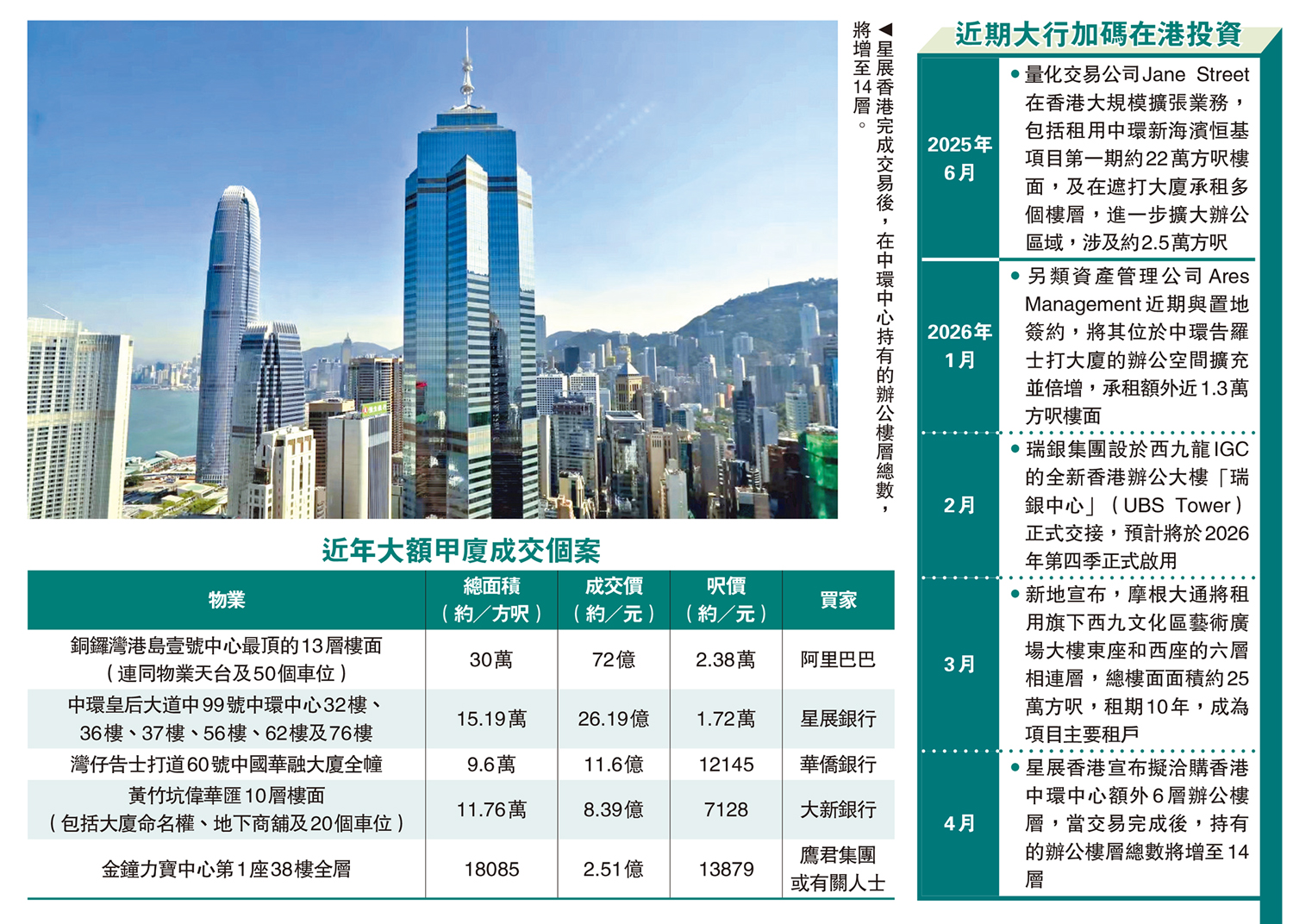 自年初以來,先後已有多家大型環球金融機構宣布在港租用大型優質寫字樓,作為擴充業務之用,昨日再添一宗。本港其中一家零售銀行星展香港證實,該行意向洽購香港中環中心(The Center)額外六層辦公樓層,成交價26.19億元,為2026年至今香港商業地產市場上最大宗交易個案,再次印證對香港的長期投資承諾。\大公報記者 黃裕慶