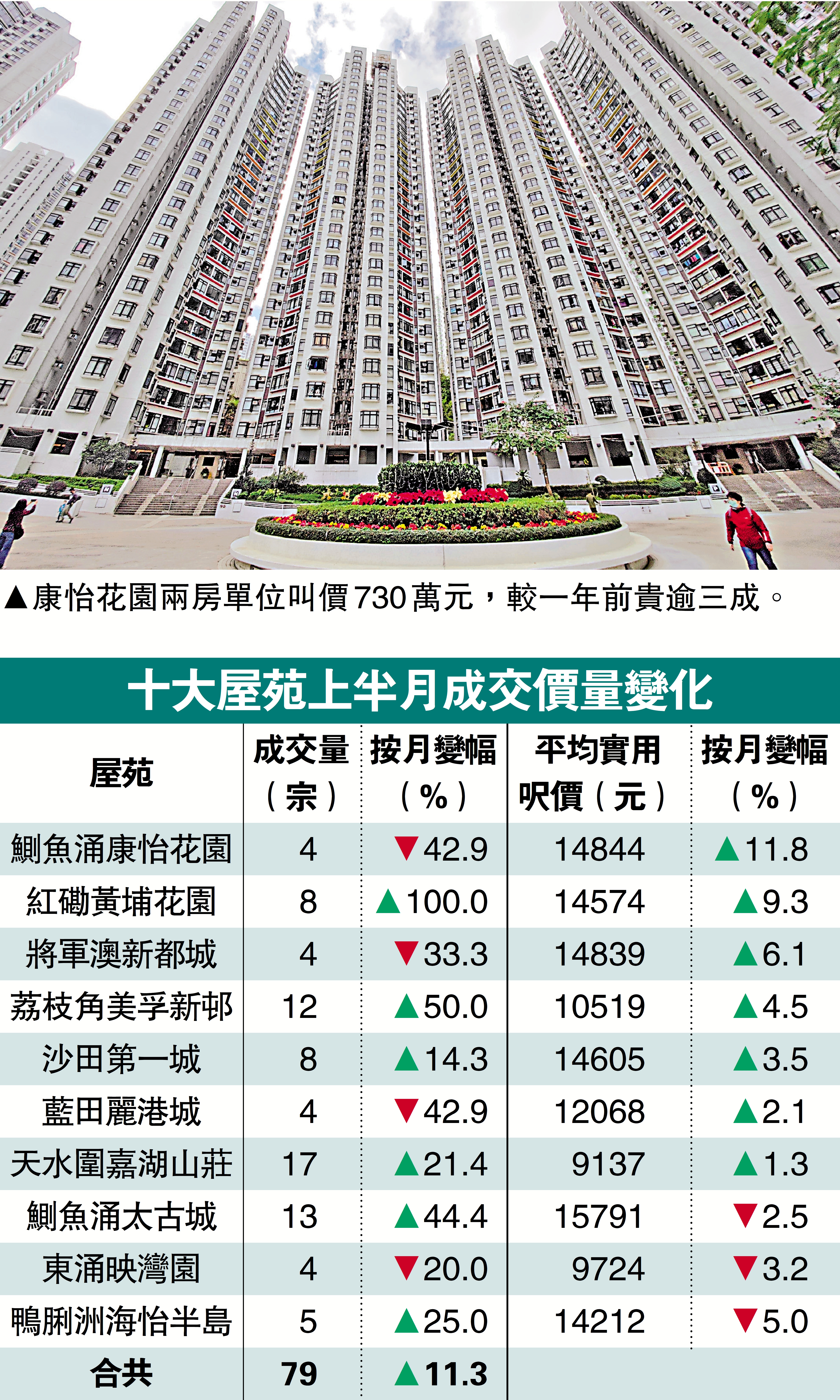 《大公報》綜合代理數字,十大屋苑本月暫錄79宗買賣,按月增逾11%,多達7個屋苑平均呎價按月上揚,升幅介乎1.3%至11.8%,其中康怡花園平均實用呎價按月急漲11.8%至14844元,惟成交量縮減至4宗,按月大跌逾四成。