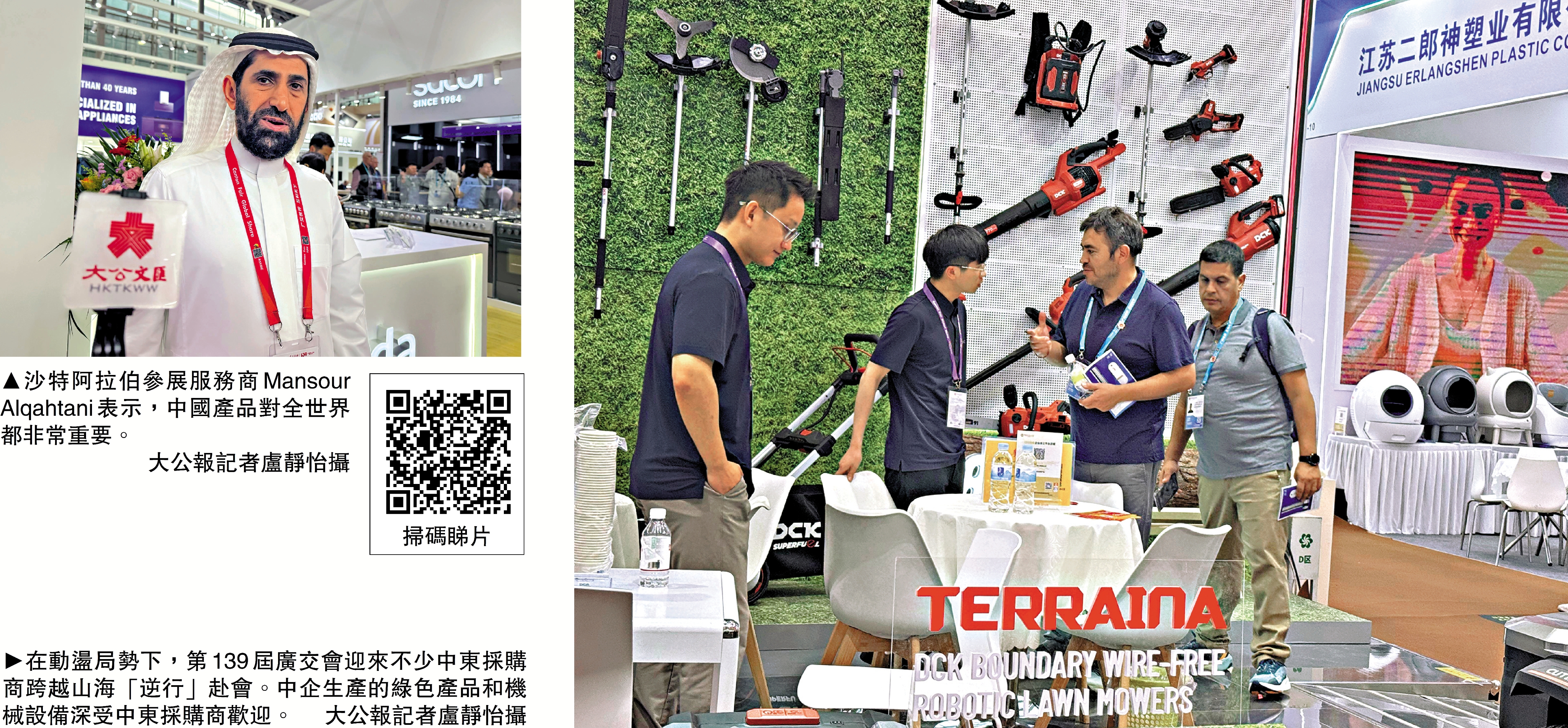 大公報記者在現場走訪中發現,經歷多屆下滑後,歐美客商呈現明顯回流態勢,「一帶一路」沿線及新興市場採購商持續活躍。中東局勢持續動盪,觸發能源危機,中國綠色產品需求大增,不少中東採購商跨越山海「逆行」赴會。一位提供產品認證服務的沙特客商向大公報記者表示,他專程從總部趕赴廣交會提供認證服務,為沙特市場尋覓更多合適的產品。\大公報記者 盧靜怡、李紫妍、帥誠廣州報道