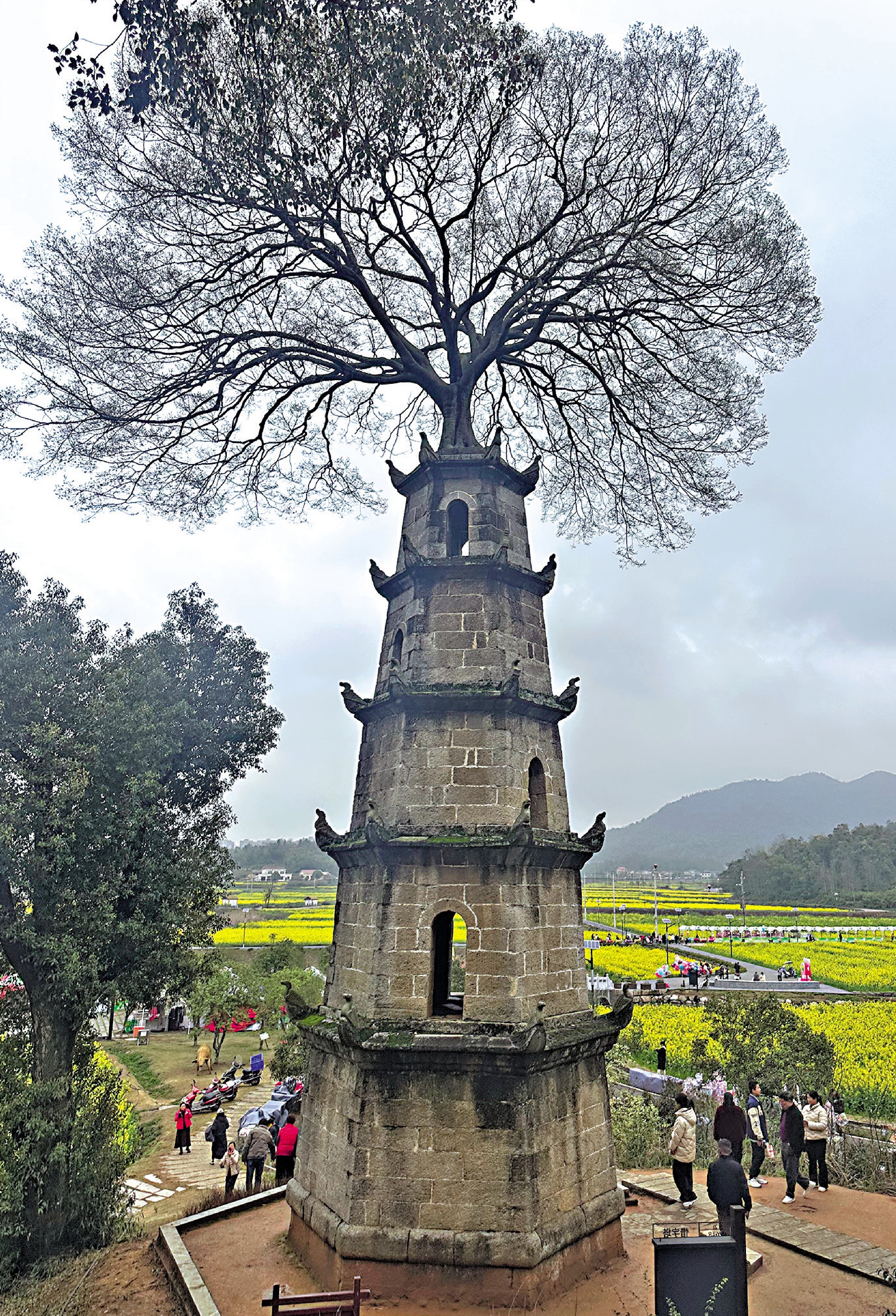 在油菜花的暗香中,我們登上了那個小山坡,向惜字塔靠近。在一處高地,望着惜字塔和塔上的朴樹,還有山下那片油菜花,如何挖空心思,也找不出一個恰當的形容詞來描繪自己的心情。塔與樹,藍天與花海,讓我們在沉默中體會着自然的魅力、時間的味道。