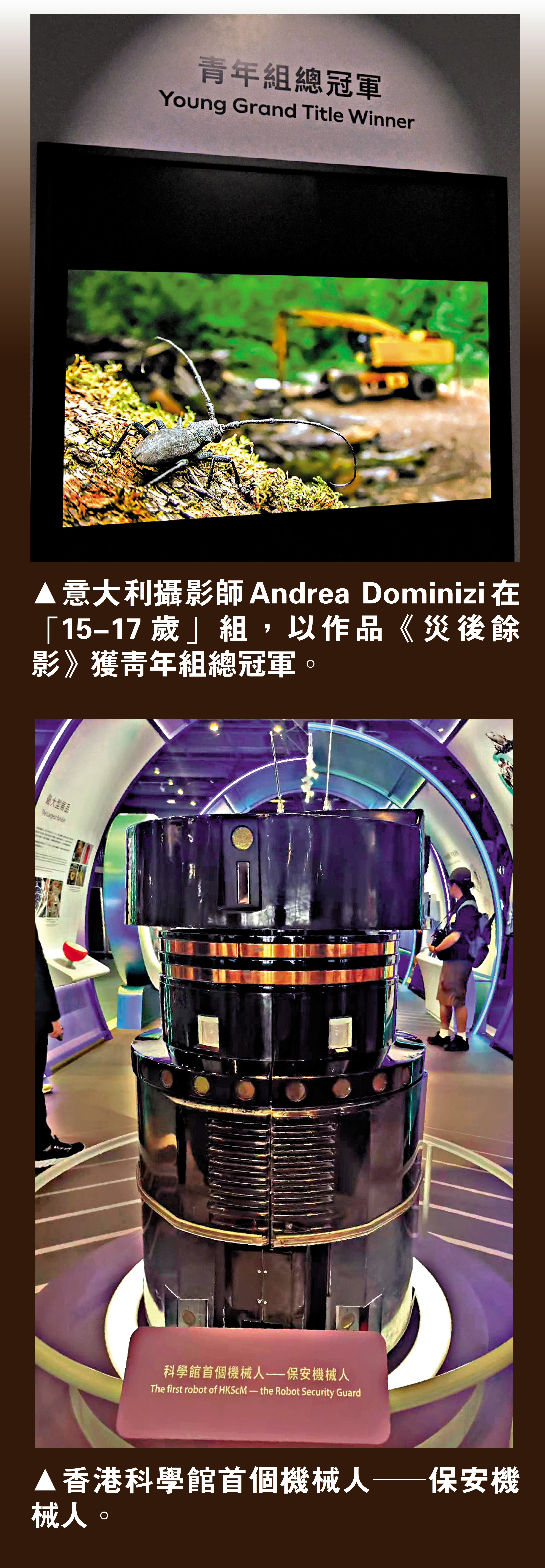 與此同時,「野外生態攝影年展」在地下特備展覽廳舉行,展出由倫敦自然歷史博物館舉辦的第61屆「野外生態攝影大賽」的得獎照片,展出近100張來自全球不同國家和地區攝影師拍攝的野外生態照片,體現大自然的真貌,揭示人類活動如何導致棲息地破碎化與全球暖化等問題。