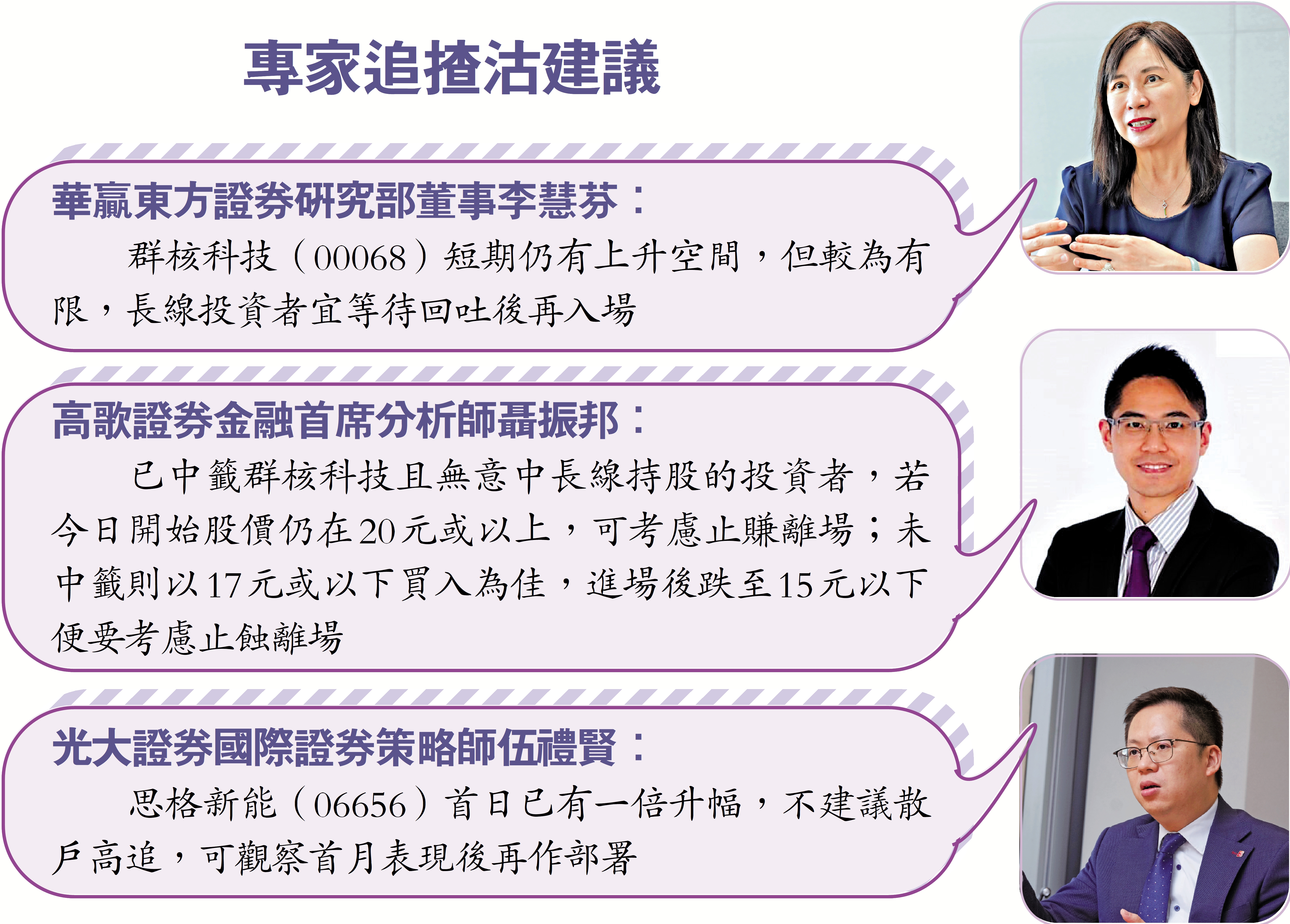已中籤群核科技且無意中長線持股的投資者,若今日開始股價仍在20元或以上,可考慮止賺離場;未中籤則以17元或以下買入為佳,進場後跌至15元以下便要考慮止蝕離場