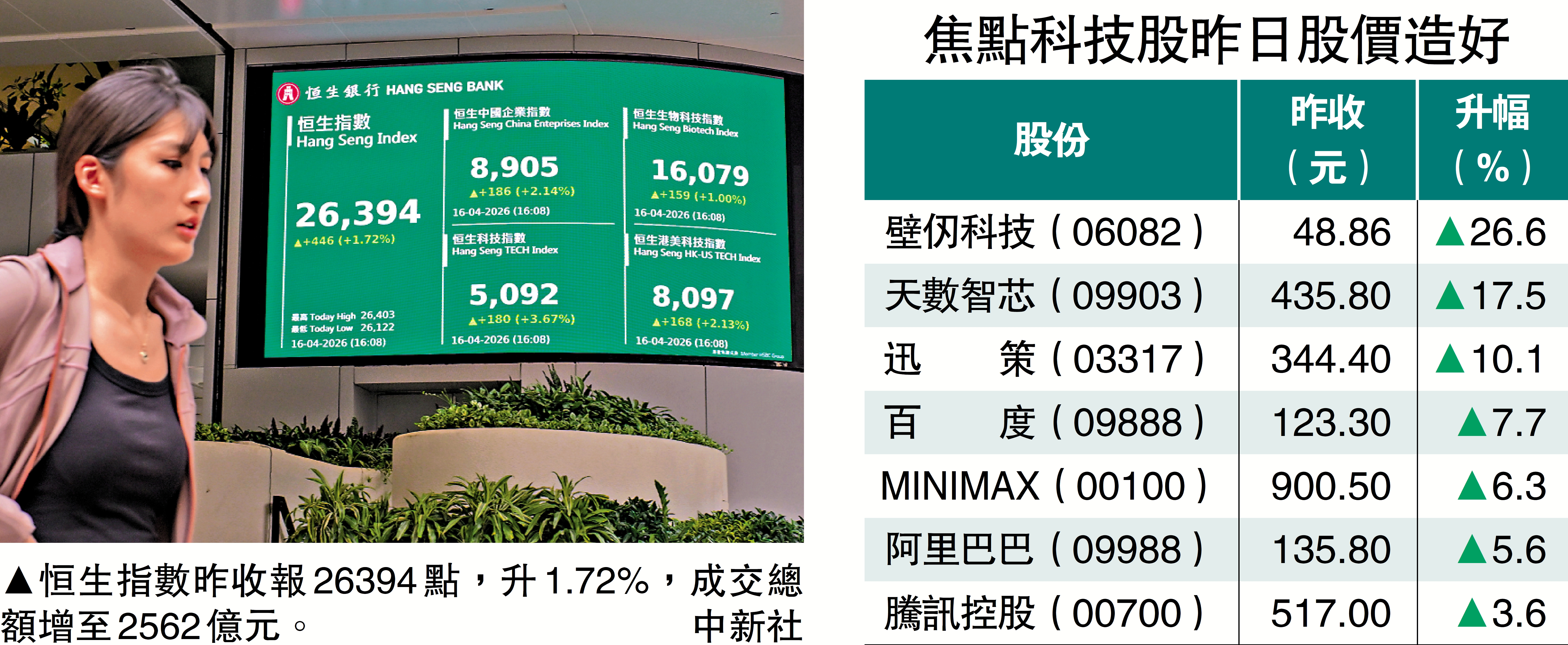 美伊軍事衝突暫時緩和,亞太區股市高收。恒指昨日升446點,報26394點,連升第三日,並且是近一個月以來再次企穩在二萬六關收市。主板成交額2562億元,較上日增加106億元,資金連續第三日增量入市。信誠證券聯席董事張智威表示,美伊繼續談判,市場憧憬地區軍事衝突緩和,甚至雙方有機會達成和議,令到風險胃納擴張,利好港股表現。然而,在美伊落實和平協議前,投資者入市態度始終較為謹慎,限制大市向上空間,恒指首個目標為26400點。