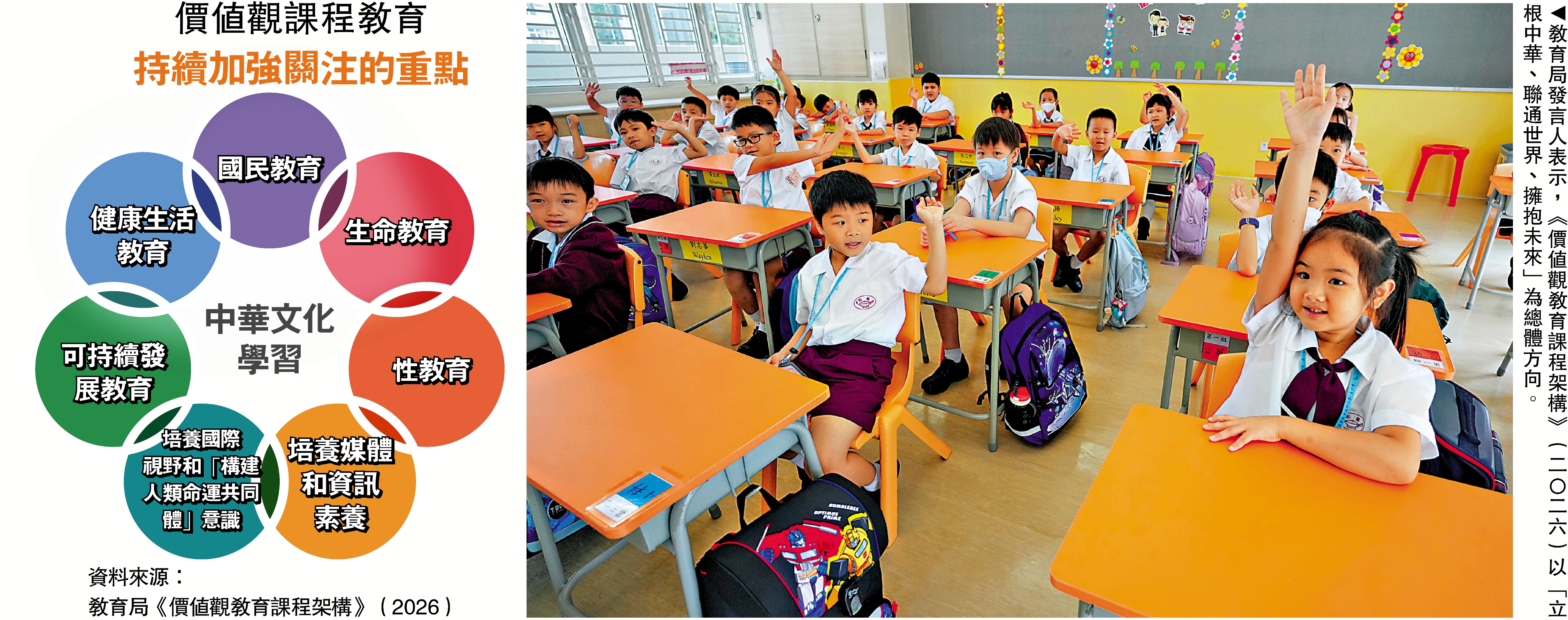 教育局發言人表示,《課程架構》(2026)以「立根中華、聯通世界、擁抱未來」為總體方向,貫徹價值觀教育以中華文化為主軸,闡明學校應持續加強關注的價值觀教育重點、課程內容、規劃與實施策略,並就各學習階段提出對學生的學習期望建議,以及提供相關資源與支援等,為學校進一步優化價值觀教育提供更清晰和具前瞻性的方向,支援學校裝備學生,面對當前和未來的機遇和挑戰。
